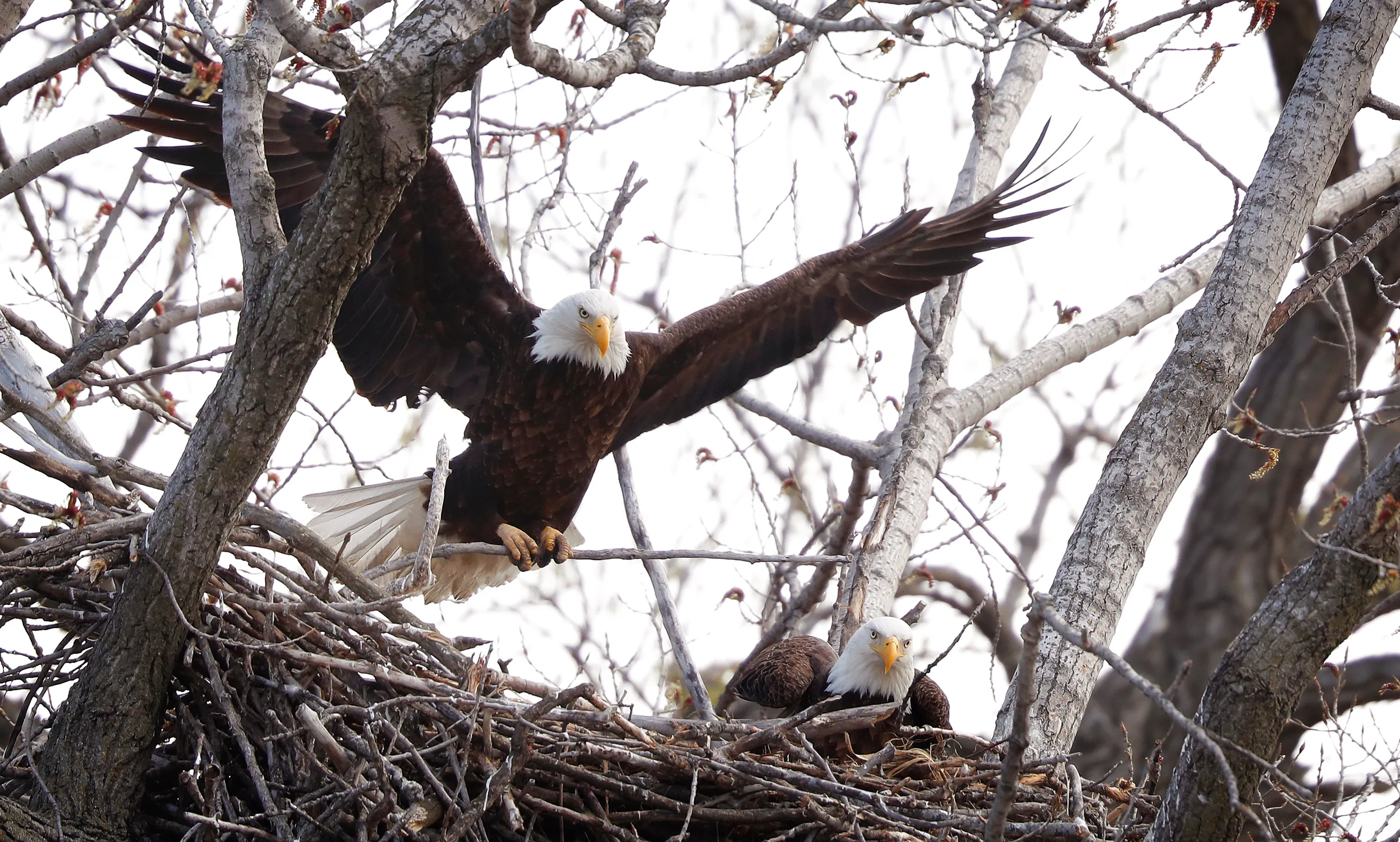 A bald eagle carrying a branch lands in its nest atop a tree overlooking the Raccoon River, Monday, April 30, 2018, at Gray's Lake Park in Des Moines, Iowa. (Photo by Charlie Neibergall/AP Photo)