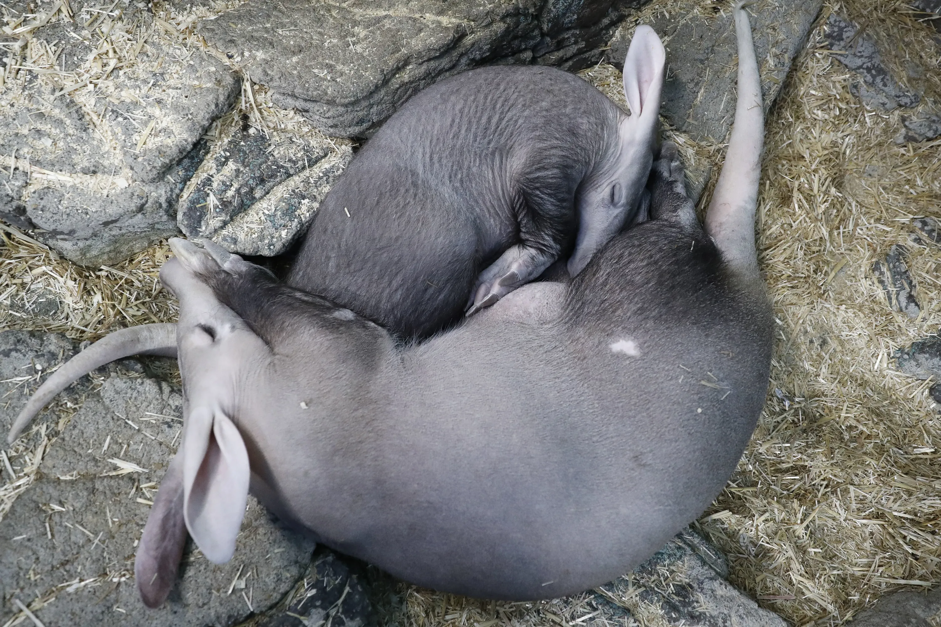 In this April 6, 2018, photo, Winsol, an aardvark born in December, above, rests alongside his mother Ali at the Cincinnati Zoo & Botanical Garden in Cincinnati. The zoo has been collecting and sending milk samples from Ali to the Smithsonian's National Zoo and the Smithsonian's Exotic Animal Milk Repository for study. (Photo by John Minchillo/AP Photo)