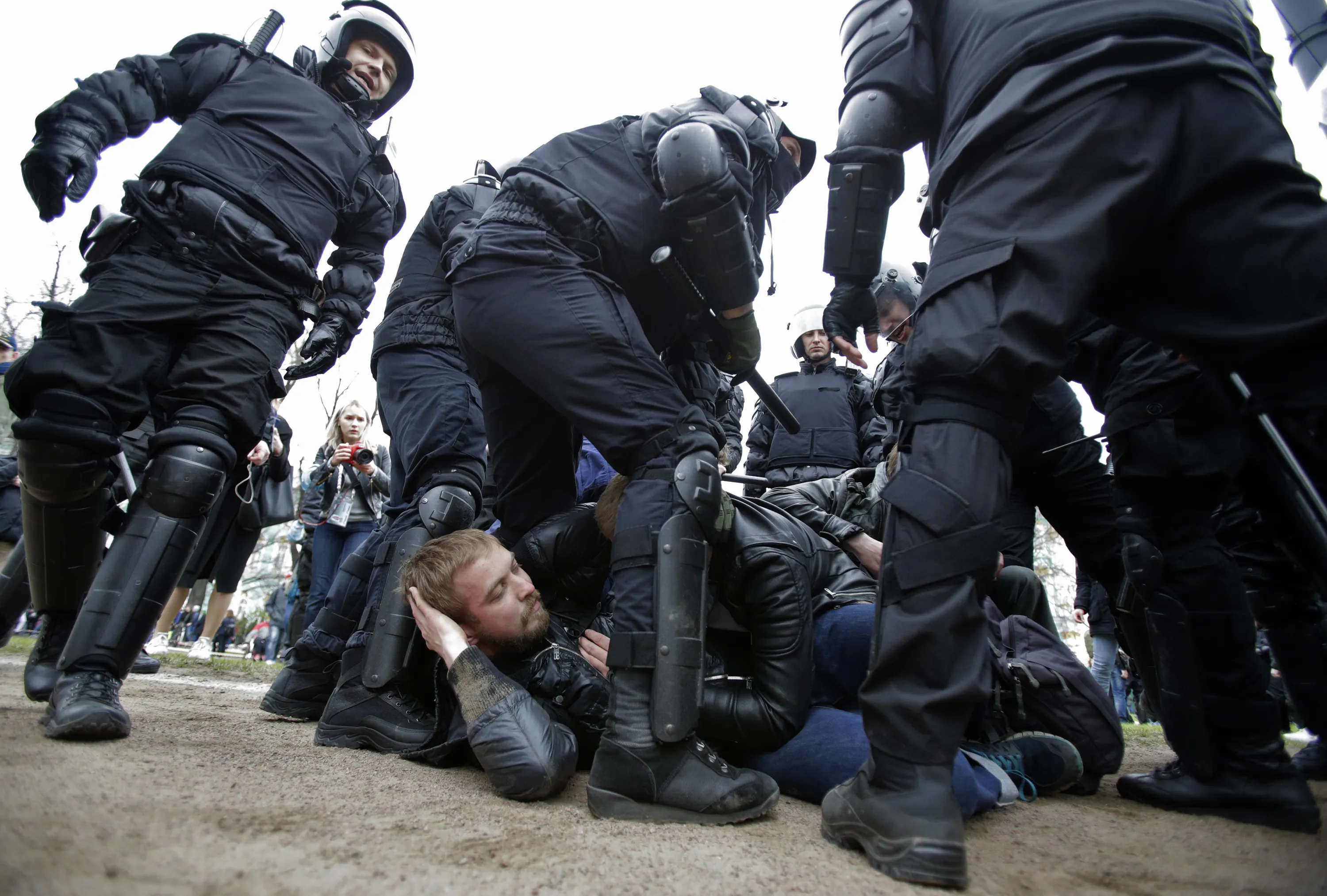 Russian police detain protesters at a demonstration against President Vladimir Putin in St. Petersburg, Russia, Saturday, May 5, 2018. Russians angered by the impending inauguration of Vladimir Putin to a new term as the country's president demonstrated throughout the country on Saturday. Police arrested hundreds, including protest organizer Alexei Navalny, the anti-corruption campaigner who is Putin's most prominent foe. (Photo by Dmitri Lovetsky/AP Photo)