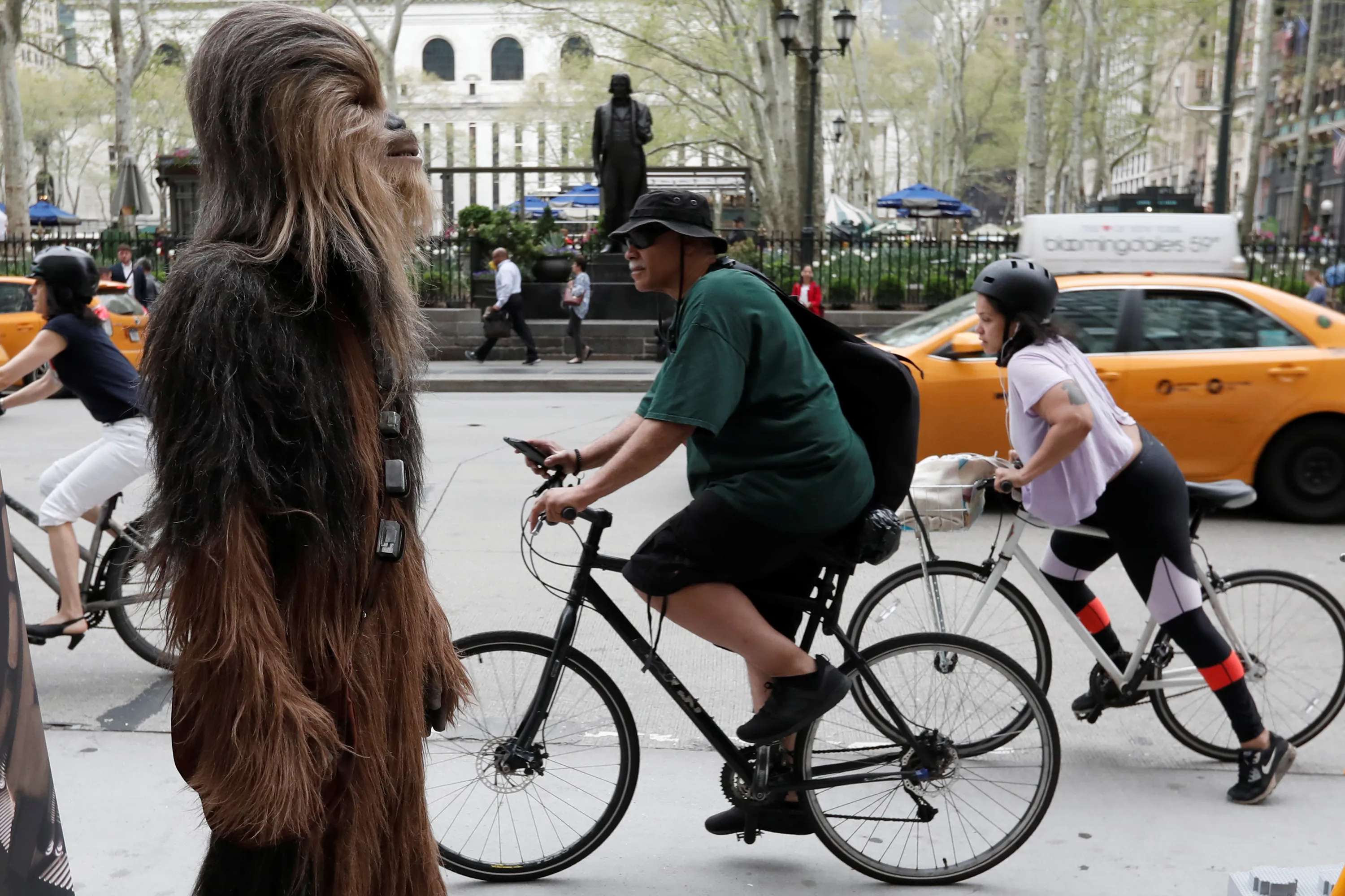 A person dressed as the Chewbacca character stands on a sidewalk as bicycle commuters pass by on 6th Avenue during a promotion for the upcoming film “Solo: A Star Wars Story” in Manhattan in New York City, New York, U.S., May 4, 2018. (Photo by Mike Segar/Reuters)