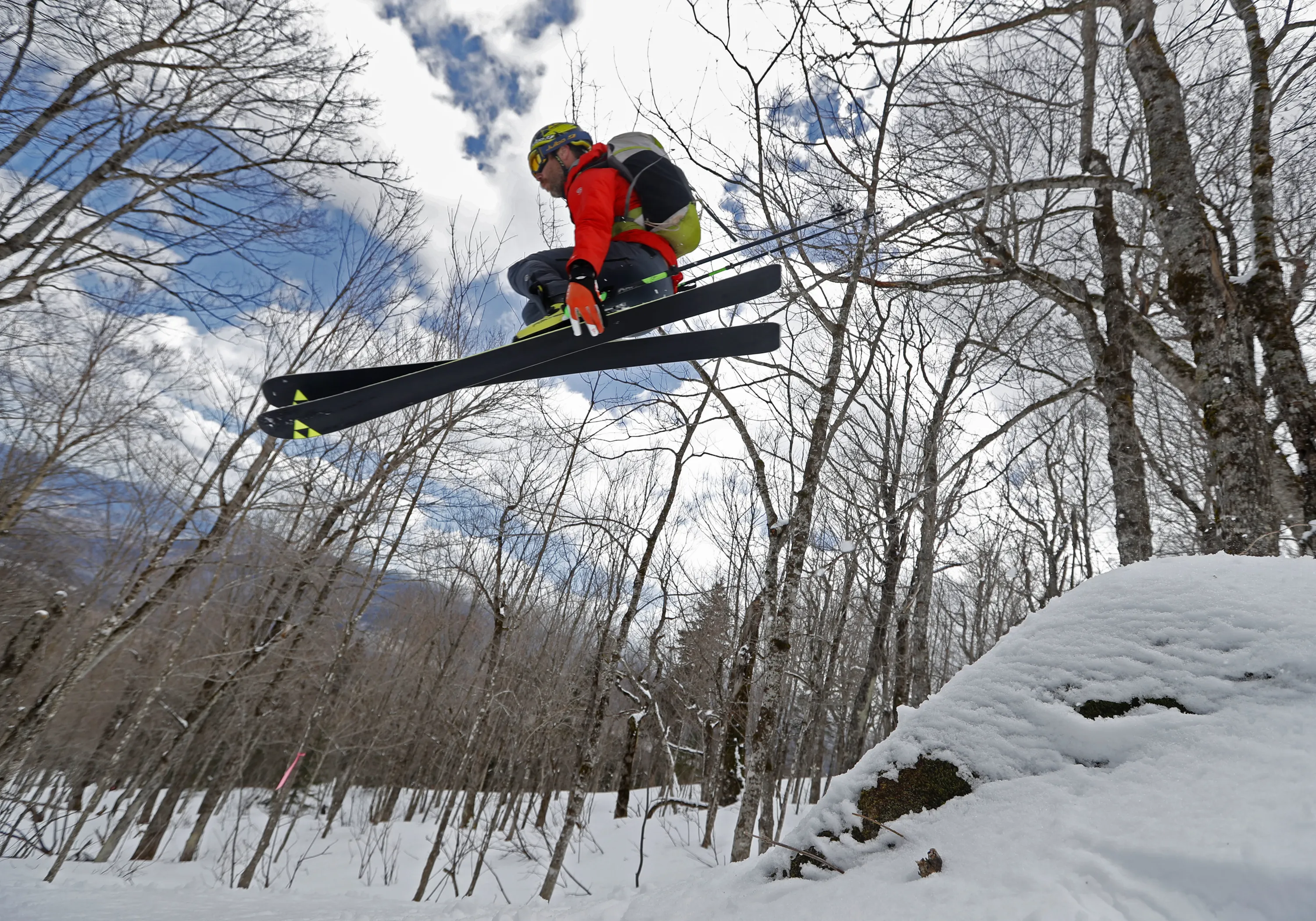 In this Saturday, April 21, 2018, photo, Andrew Drummond “sends” a large rock while skiing in the glades on Crescent Ridge in the Randolph Community Forest in Randolph, New Hampshire. (Photo by Robert F. Bukaty/AP Photo)