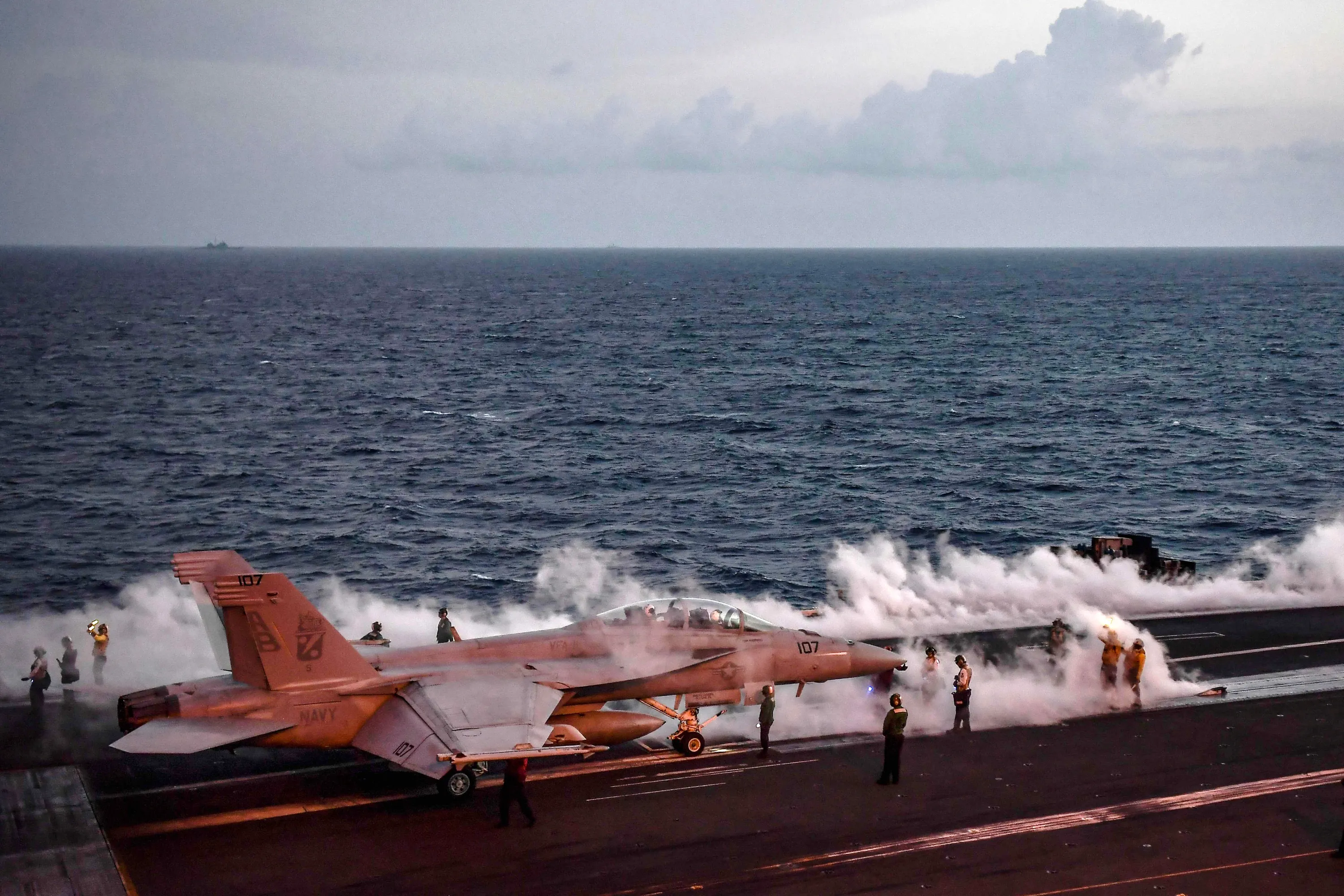 A F18-C Hornet fighter jet waits to take off from the deck of the 330 meters US navy aircraft carrier the USS Harry S. Truman in the eastern Mediterranean Sea on May 8, 2018. The USS Harry S. Truman Carrier Strike Group on May 3 began air operations in support of Operation Inherent Resolve, conducting flight operations against the so called Islamic State (IS) targets in Syria and Iraq. The strike group includes a guided-missile cruiser and four guided-missile destroyers. (Photo by Aris Messinis/AFP Photo)
