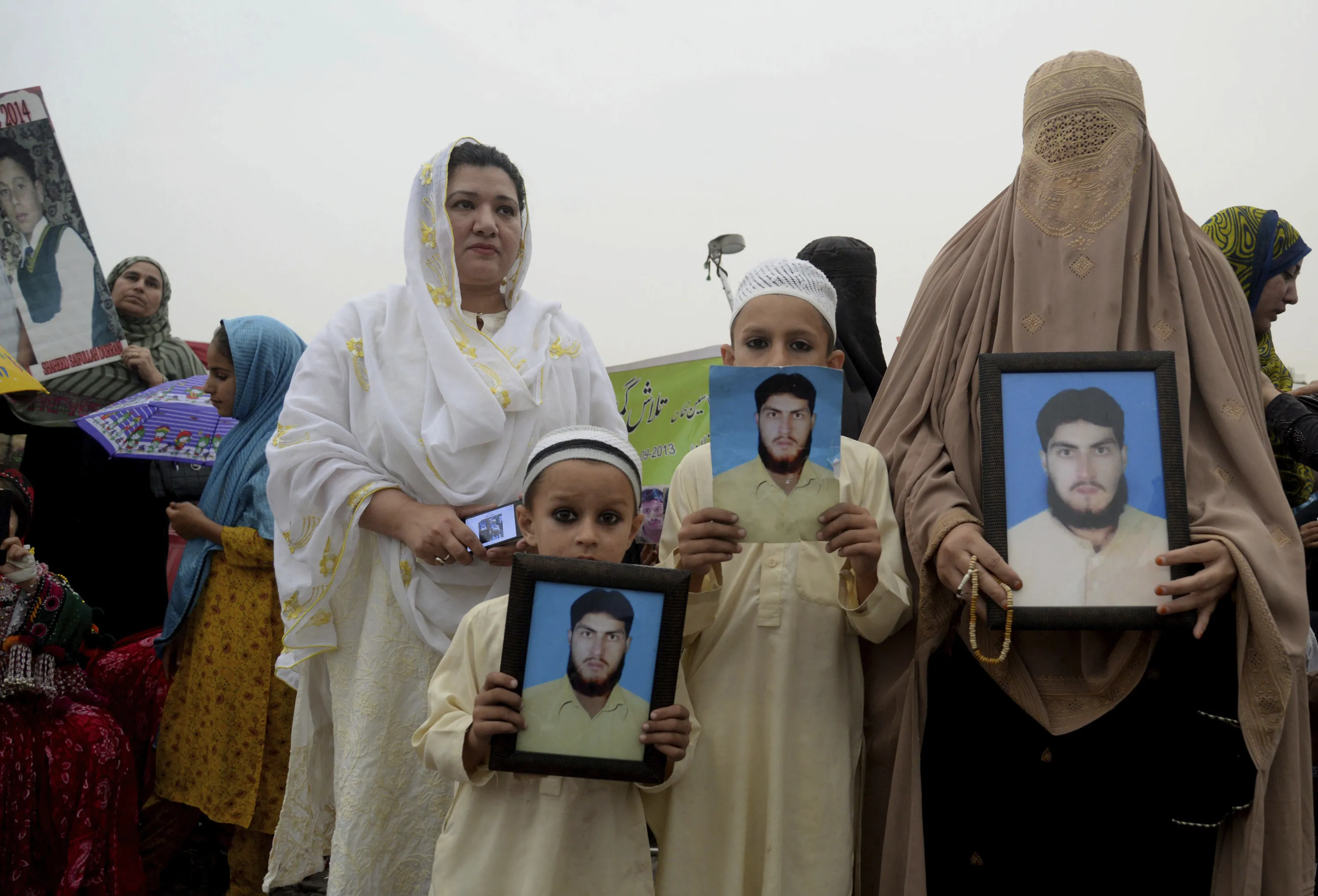 In this Sunday, April 8, 2018 file photo, a Pashtun family from a Pakistani tribal area display pictures of a missing family member during a Pashtun Protection Movement rally in Peshawar, Pakistan. A Pakistani rights group in the country's troubled border region has been protesting police brutality, censorship and disappearances, drawing a police campaign against its members and deepening tensions. (Photo by Muhammad Sajjad/AP Photo)