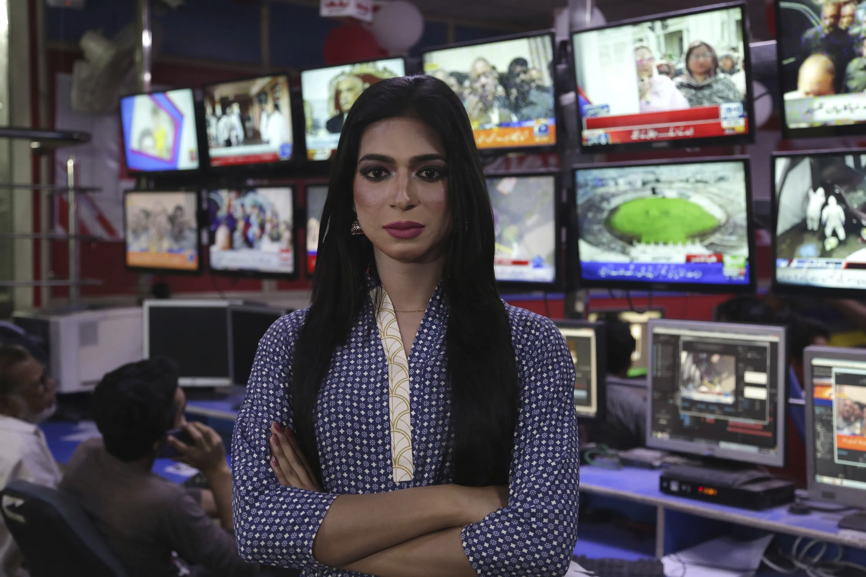 In this photo taken on Tuesday, March 27, 2018, Pakistan's first transgender newscaster Marvia Malik poses for a photo in a control room of a local television channel in Lahore, Pakistan. Malik has made history in Pakistan by becoming the first transgender newscaster in a conservative Muslim country where her community is taunted in public, ostracized by family and targeted in violent attacks. (Photo by K.M. Chaudary/AP Photo)