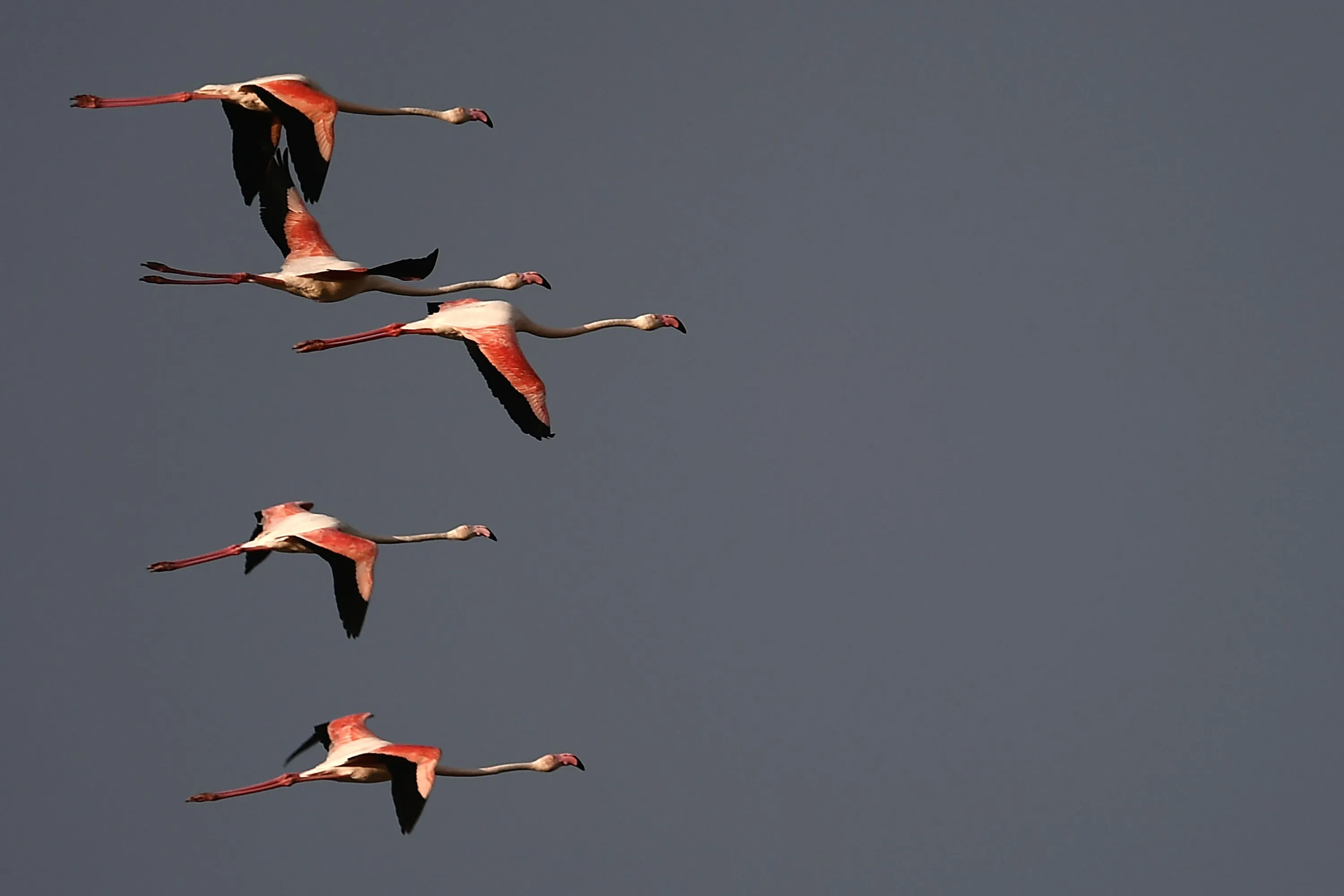 Flamingos fly at sunset on May 6, 2018 in Cagliari, Italy. (Photo by Marco Bertorello/AFP Photo)