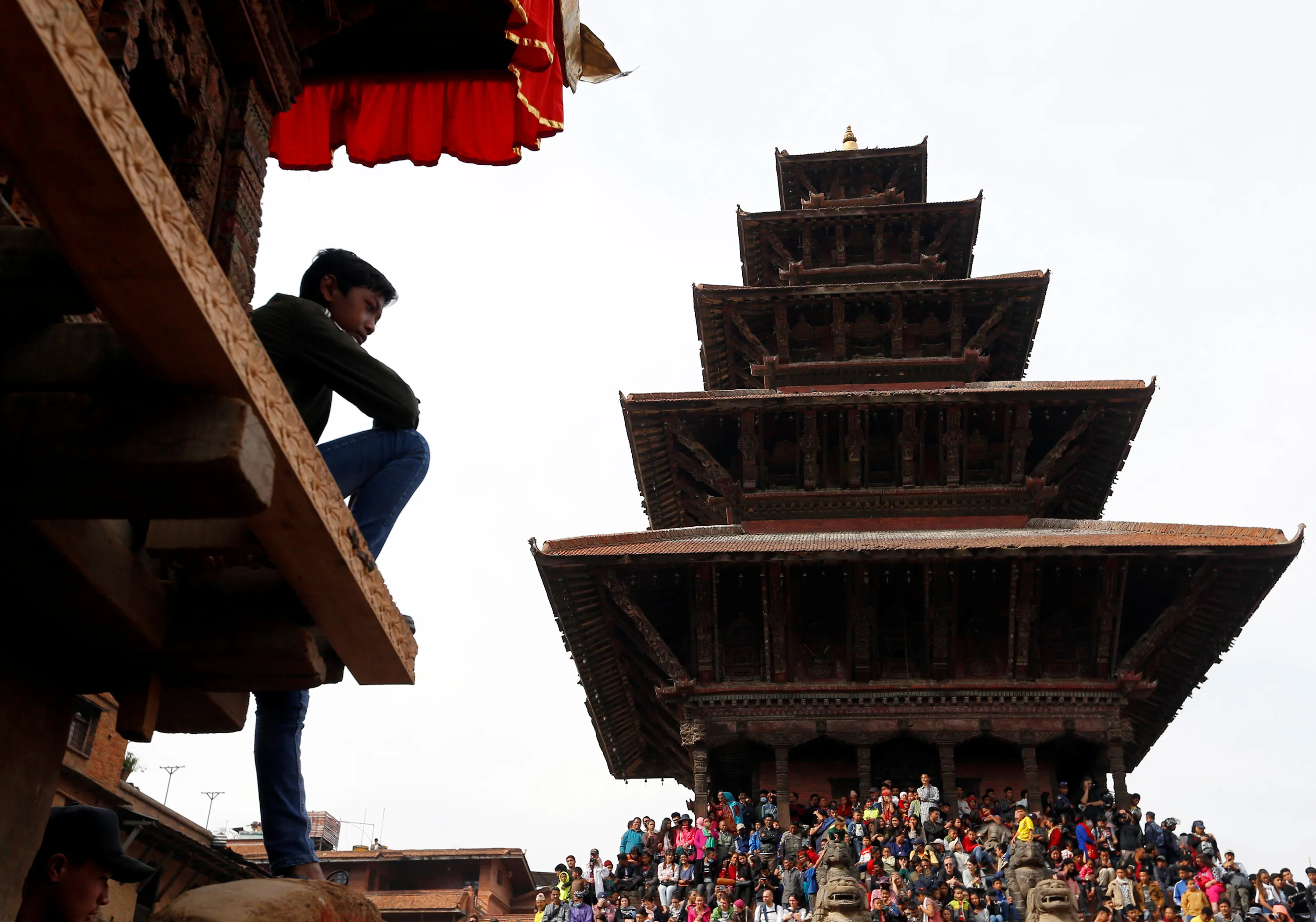 A boy sits on the chariot of God Bhairab as people gather for the Biska Festival also known as Bisket festival in Bhaktapur, Nepal April 10, 2018. (Photo by Navesh Chitrakar/Reuters)