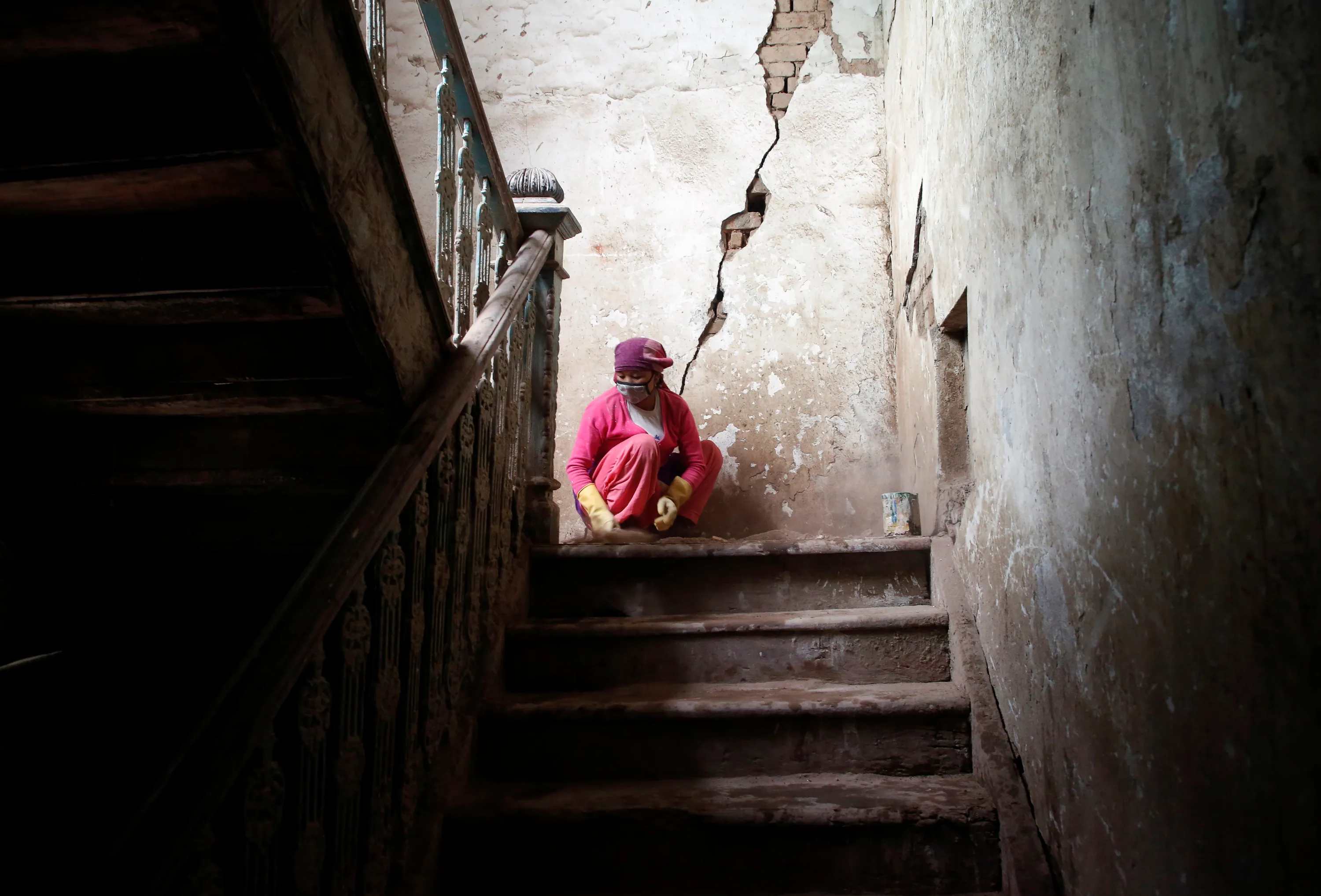 A worker cleans the premises of the 20th century Gaddi Baithak, which was damaged during the 2015 earthquake that killed around 9000 people, in Kathmandu, Nepal on April 25, 2018. (Photo by Navesh Chitrakar/Reuters)