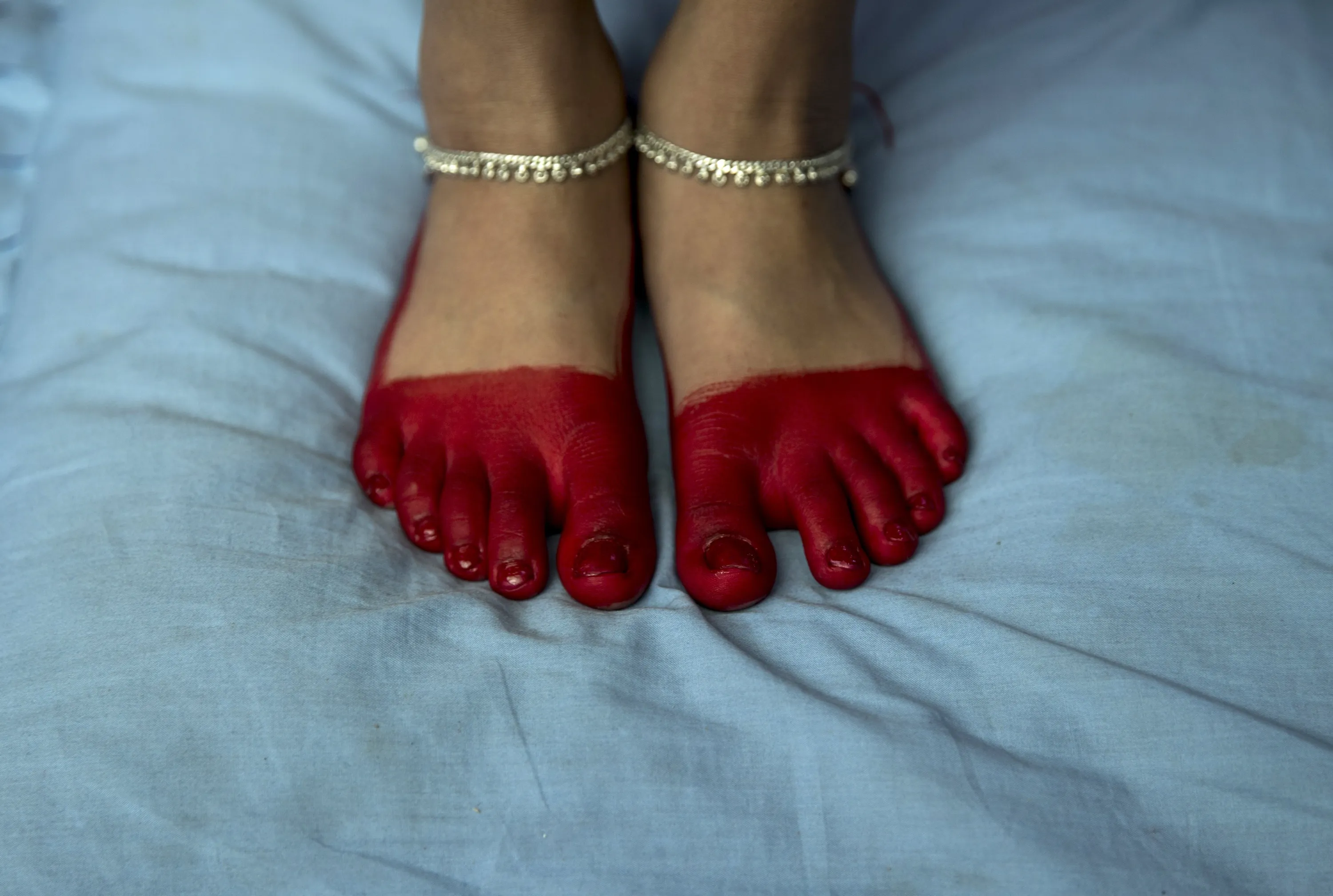 Traditional red paint decorates a young girl's feet during the conclusion of the Gufa ceremony at Ugrachandi Tamrakar Society in Lalitpur, Nepal, 24 April 2018. The Gufa, or Barha, is a 12-day coming of age ceremony in the Newar community, during which young girls are kept in a dark room away from sunlight and any male contact, symbolizing purification. On the final day the girls are symbolically married to the sun god and celebrate the occasion with their friends and family members with a traditional party. (Photo by Narendra Shrestha/EPA/EFE)