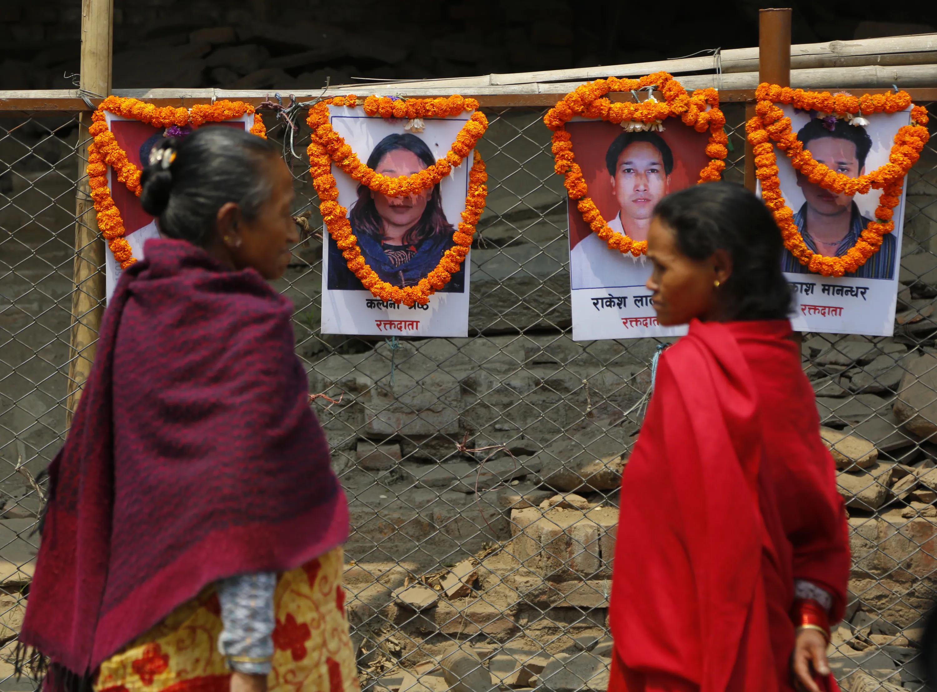 Nepalese women look at portraits of victims of the 2015 earthquake during a function to mark the third anniversary of the earthquake in Kathmandu, Nepal, Wednesday, April 25, 2018. (Photo by Niranjan Shrestha/AP Photo)