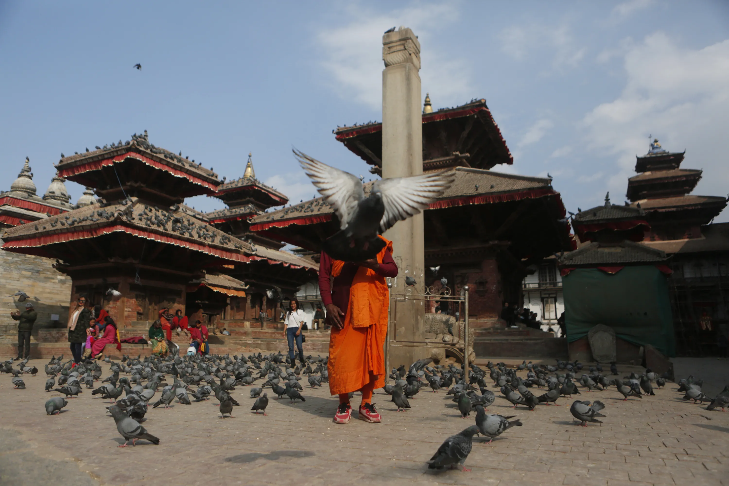 A Nepalese monk waits for alms surrounded by pigeons in Basantapur Durbar Square, Kathmandu, Nepal, Monday, February 26, 2018. Basantapur Durbar Square is the plaza in front of the royal palace, a UNESCO World Heritage site, frequented by tourists. (Photo by Niranjan Shrestha/AP Photo)