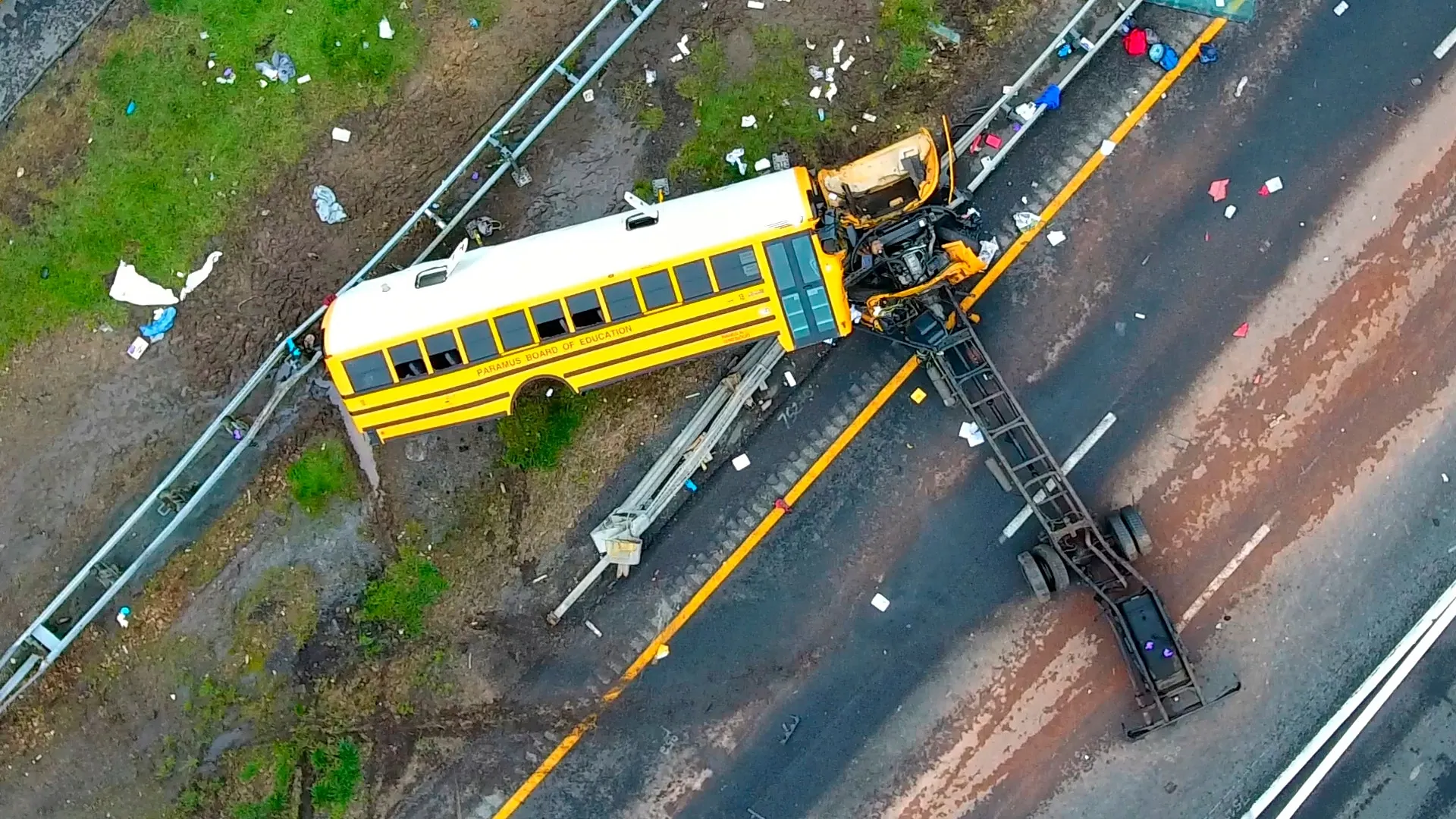 In this aerial photo, a school bus lies crashed on Route 80 in Mount Olive, N.J., Thursday, May 17, 2018. The Paramus school district says the bus was taking students on Thursday from East Brook Middle School to Waterloo Village, a historic site near the crash scene. The yellow school bus was carrying 38 students and seven adults when it crashed, killing a student and a teacher. (Photo by Andre Malok/NJ Advance Media via AP Photo)