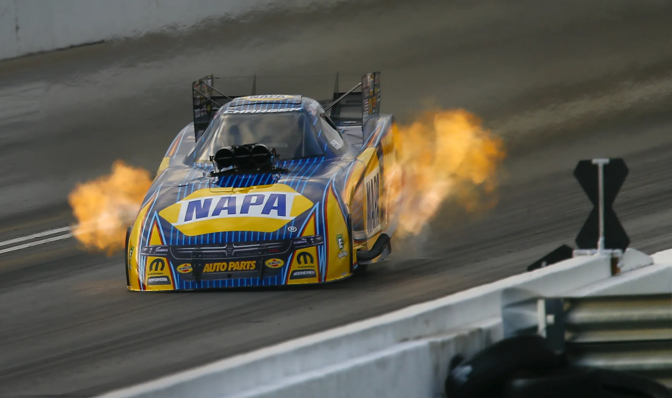 Funny Car driver Ron Capps races to the finish line during his second qualifying run at the Menards NHRA Heartland Nationals drag races Friday, May 18, 2018, at Heartland Motorsports Park in Topeka, Kan. (Photo by Chris Neal/The Capital-Journal via AP Photo)
