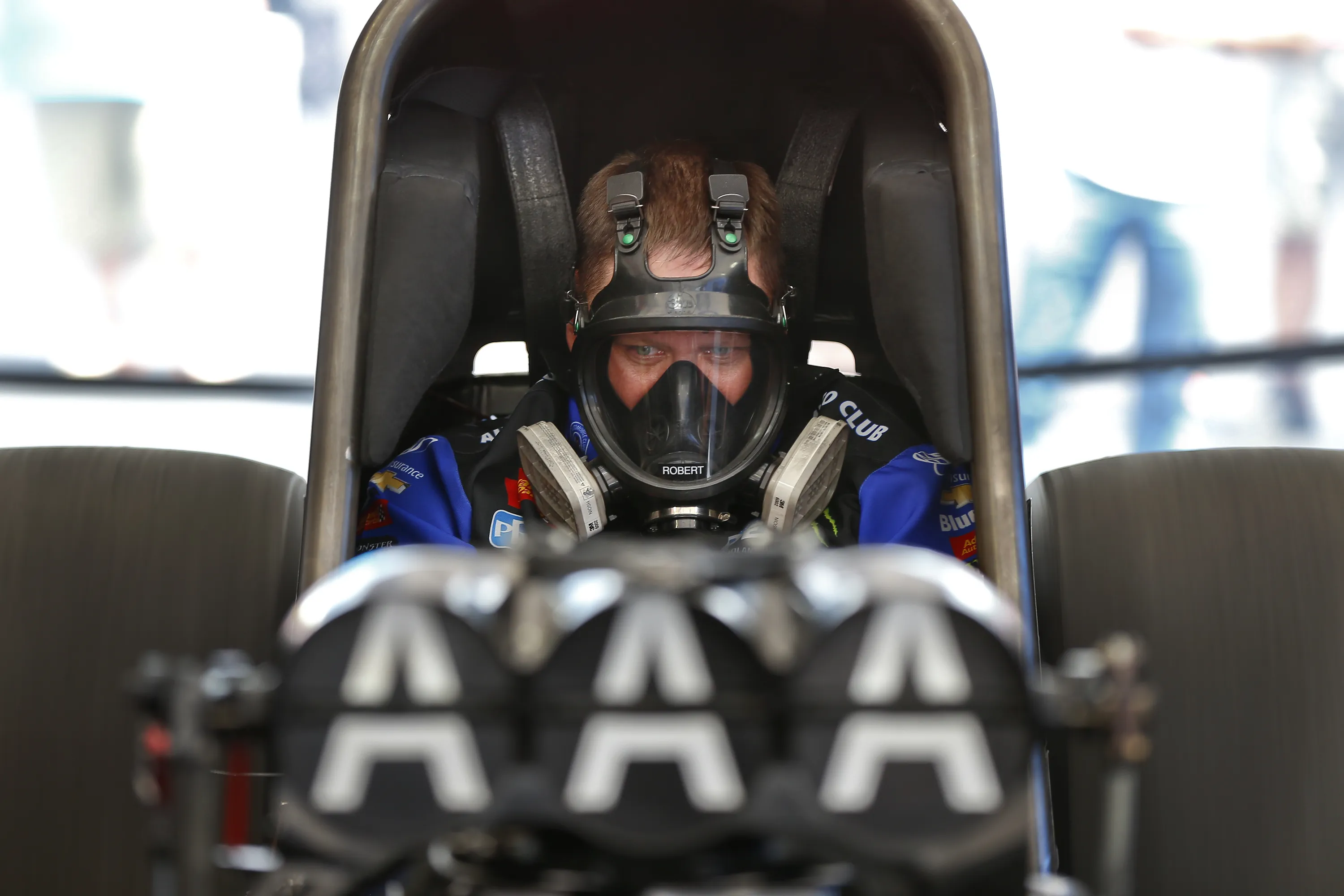 Funny Car driver Robert Hight starts his car for a pre-race check in the pits prior to his first qualifying run at the Menards NHRA Heartland Nationals drag races Friday, May 18, 2018, at Heartland Motorsports Park in Topeka, Kan. (Photo by Chris Neal/The Capital-Journal via AP Photo)