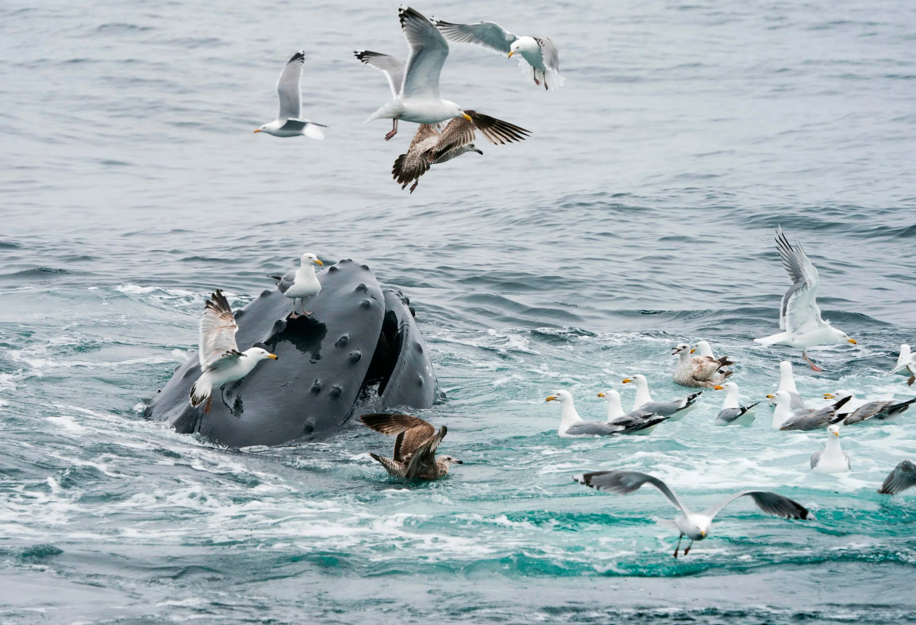 A gull stands on the rostrum of a feeding humpback whale hoping to snatch a sand eel missed by the feeding humpback in the Stellwagen Bank National Marine Sanctuary May 10, 2018 near Gloucester, Massachusetts. The humpbacks were feeding on sand eels by utilizing the bubble net method to trap the eels and then swimming up through it with their mouths open. (Photo by Don Emmert/AFP Photo)