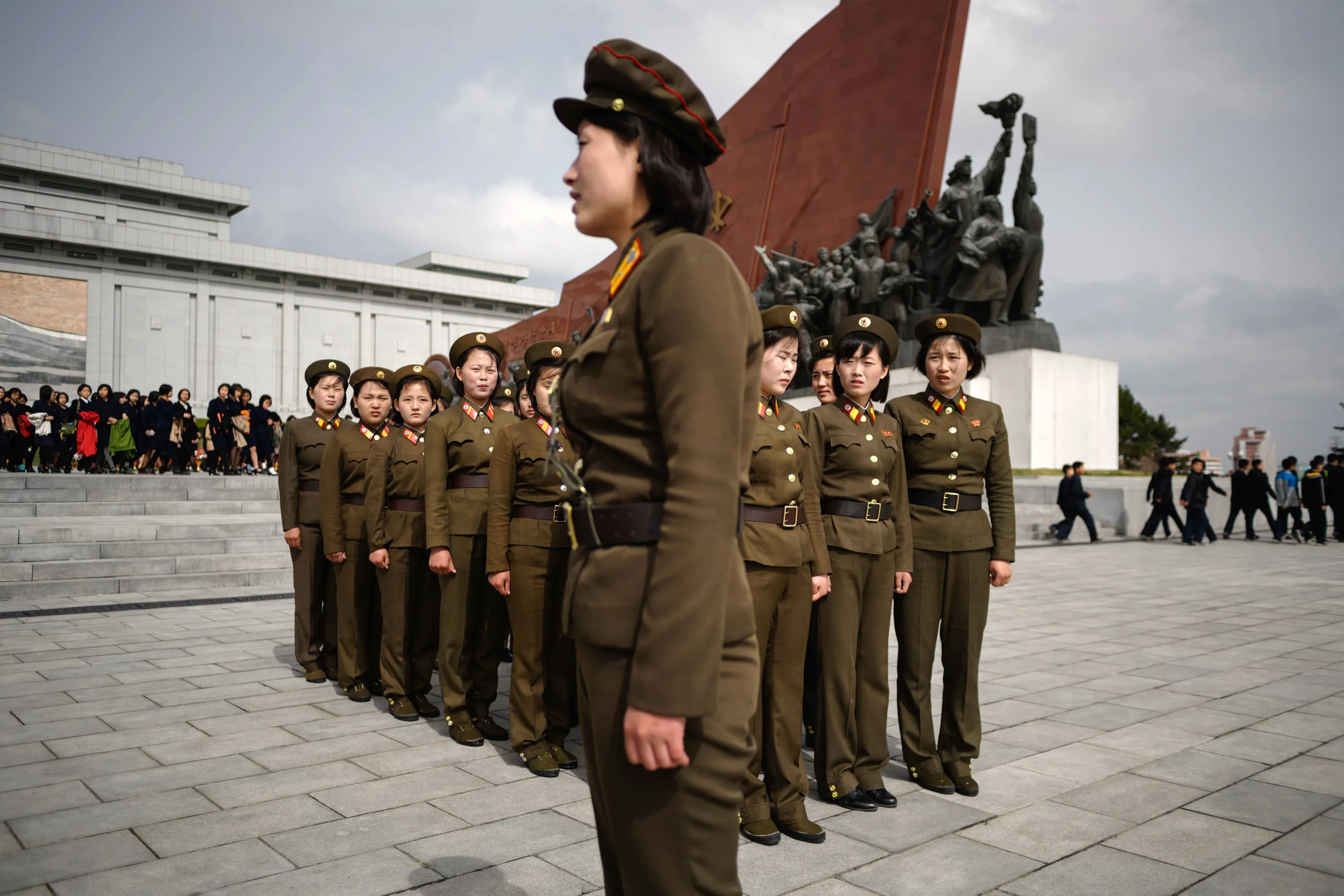 Female Korean People' s Army (KPA) soldiers gather after paying their respects before the statues of late North Korean leaders Kim Il Sung and Kim Jong Il, at Mansu hill in Pyongyang April 15, 2018. Thousands of North Korean devotees laid flowers before statues of the country' s founder Kim Il Sung on the anniversary of his birth. Current leader Kim Jong Un is the third of the dynasty to head the isolated, nuclear- armed country, where the calendar is packed with anniversaries relating to his two forefathers and their careers. (Photo by Ed Jones/AFP Photo)