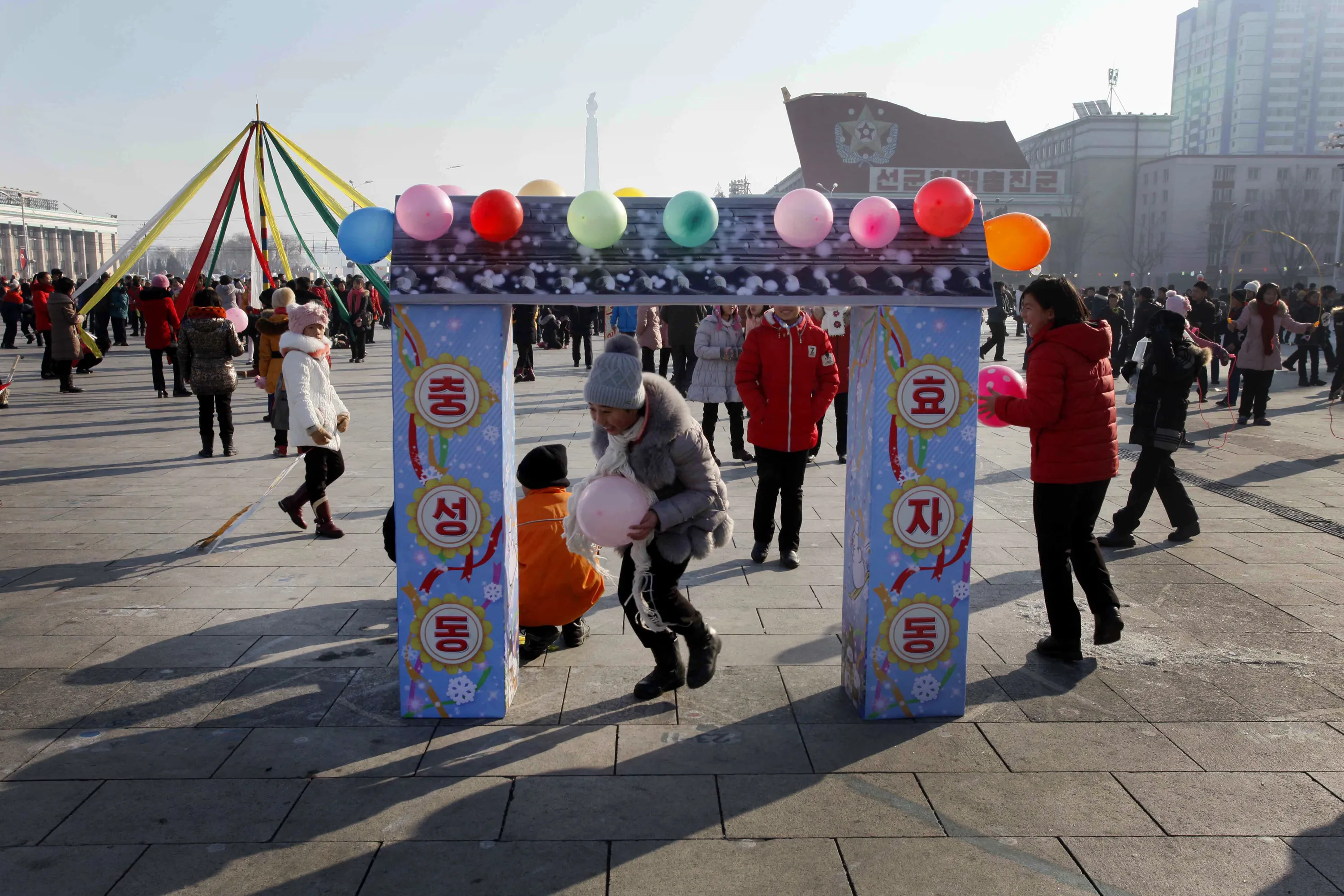 North Koreans children play as others gather on Kim Il Sung Square to celebrate the New Year on Monday, January 1, 2018, in Pyongyang, North Korea. (Photo by Jon Chol Jin/AP Photo)