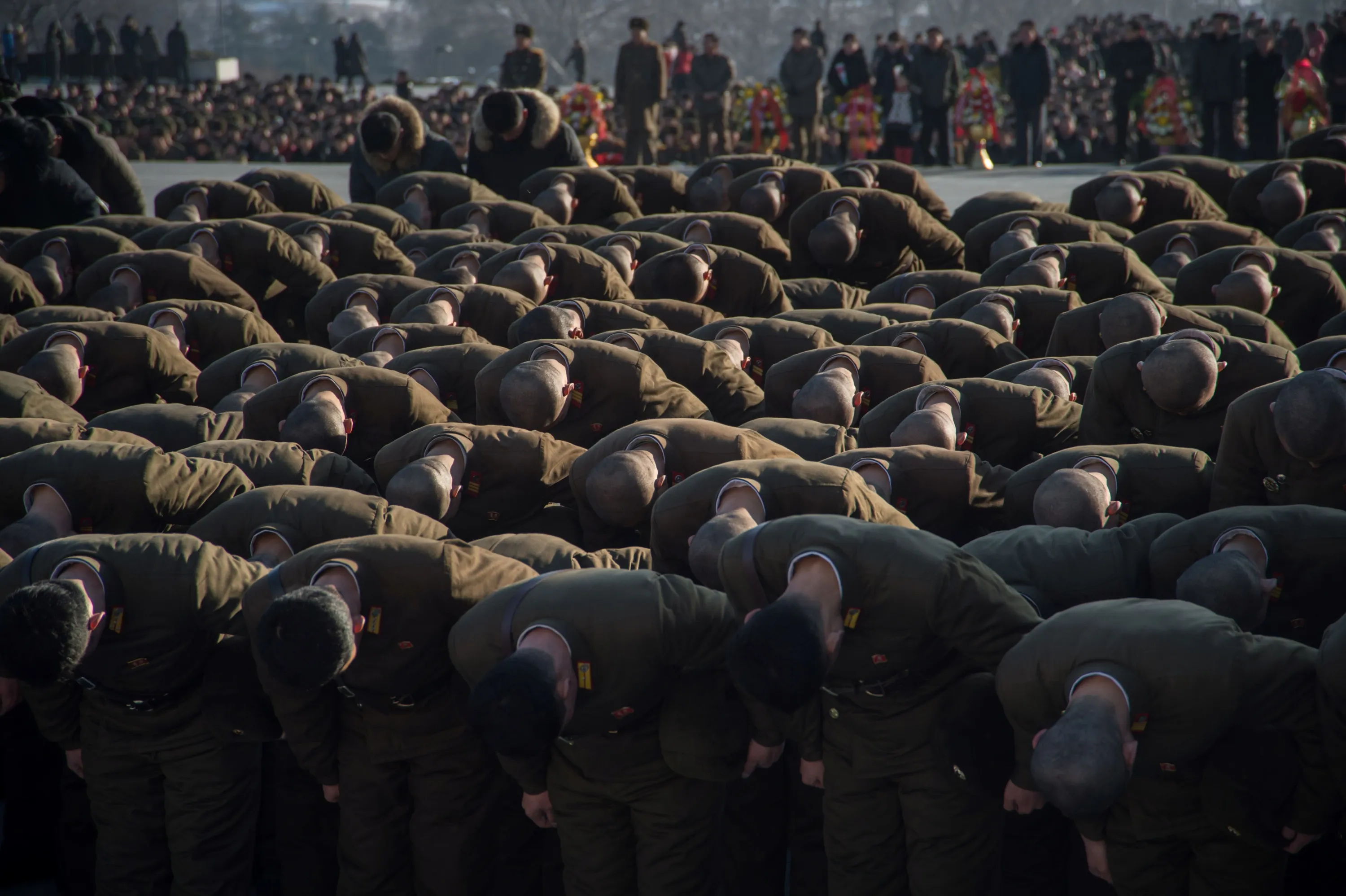 Korean People's Army (KPA) soldiers bow before statues of late North Korean leaders Kim Il-Sung and Kim Jong-Il to mark the sixth anniversary of the death of Kim Jong-Il, at Mansu hill in Pyongyang on December 17, 2017. (Photo by Kim Won-Jin/AFP Photo)