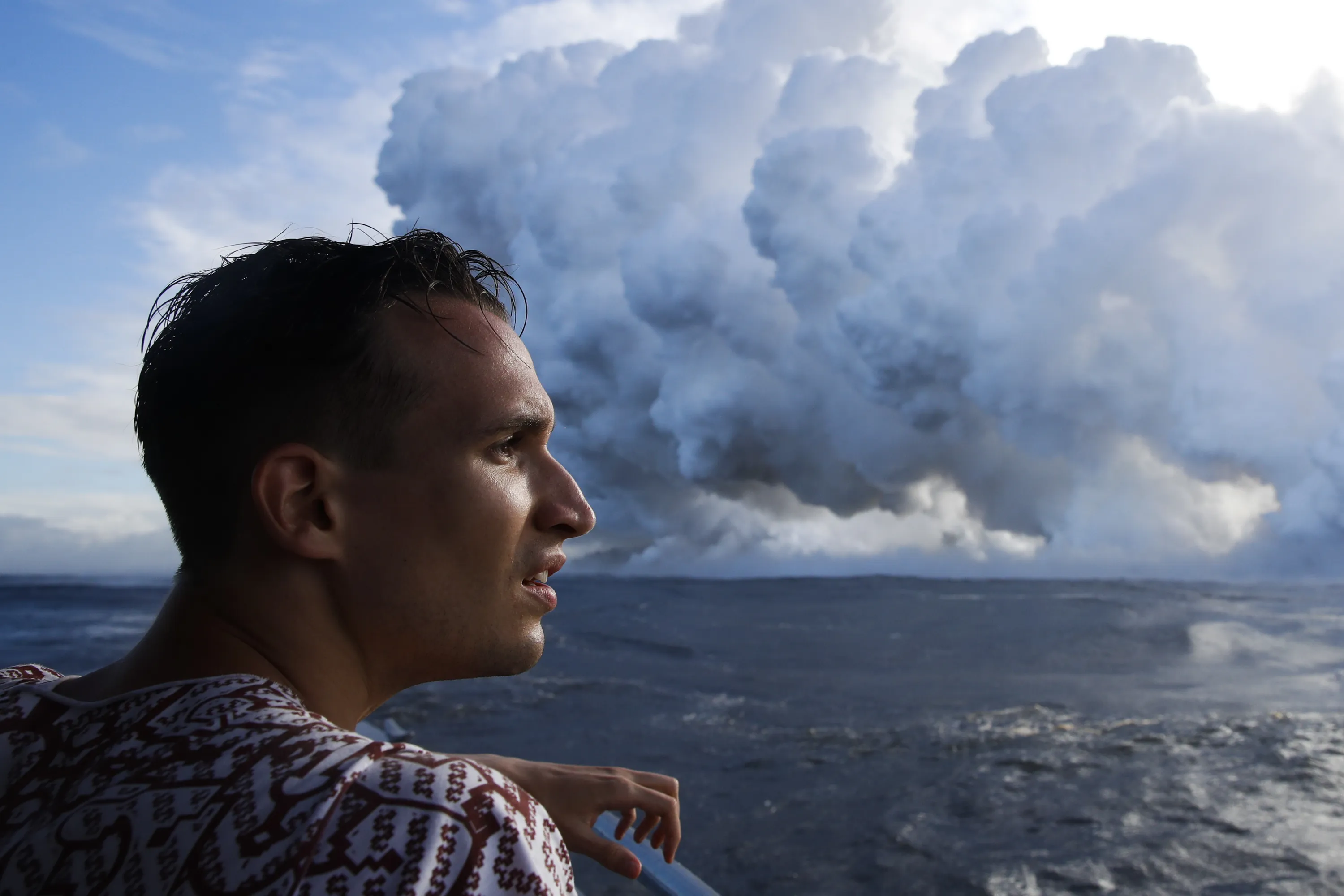 Gabor Kovacs, visiting from Hungary, watches as lava flows into the ocean, generating plumes of steam, near Pahoa, Hawaii Sunday, May 20, 2018. Kilauea volcano that is oozing, spewing and exploding on Hawaii's Big Island has gotten more hazardous in recent days, with rivers of molten rock pouring into the ocean Sunday and flying lava causing the first major injury. (Photo by Jae C. Hong/AP Photo)