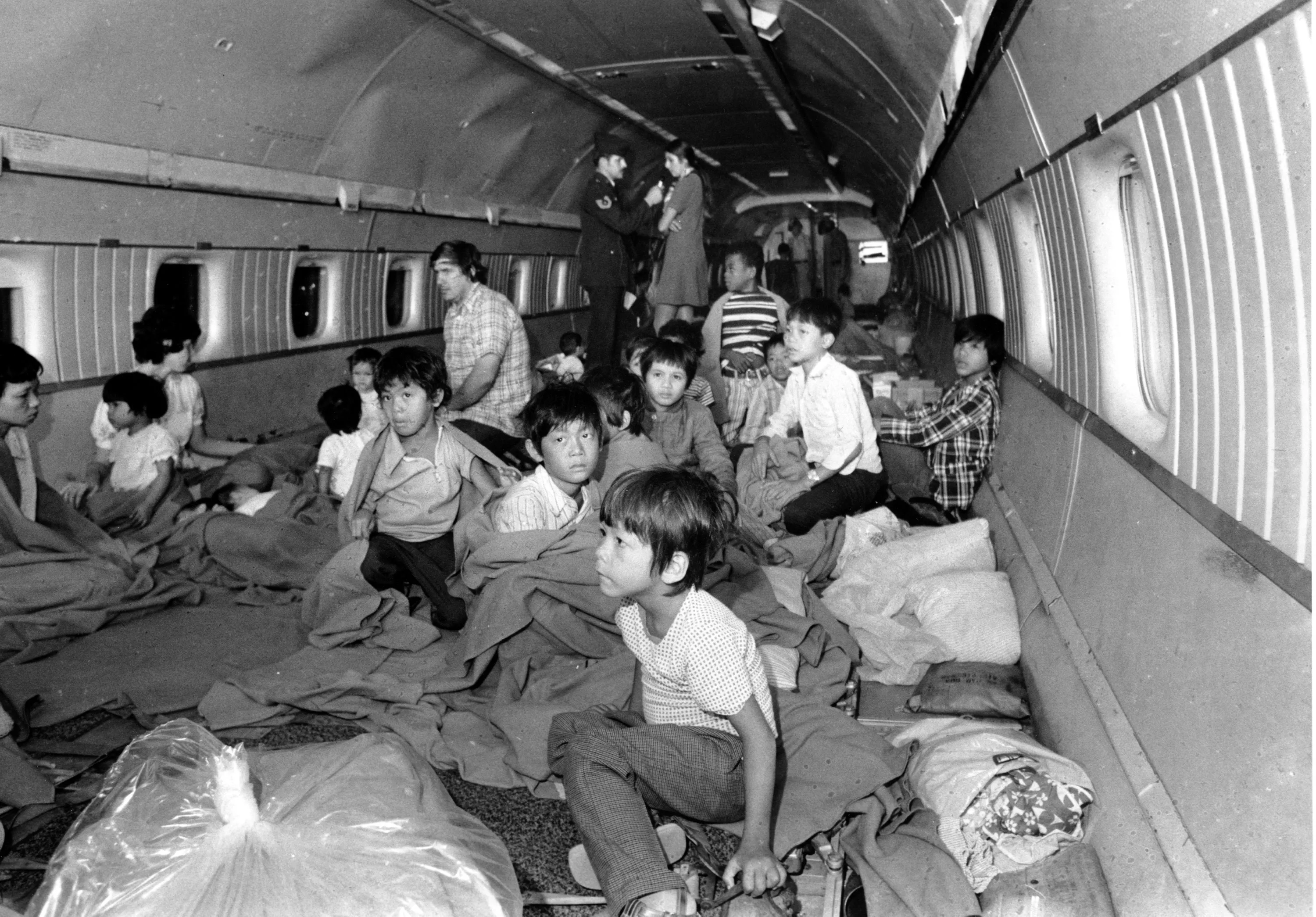 Vietnamese orphans, some wrapped in blankets, sit on the floor of a World Airway DC8 jet as the plane stopped over at Yokata U.S. Air Force Base in northewestern Tokyo, during the Vietnam War, April 3, 1975. The children are the first South Vietnam refugees evacuated aboard an American airliner. (Photo by AP Photo)
