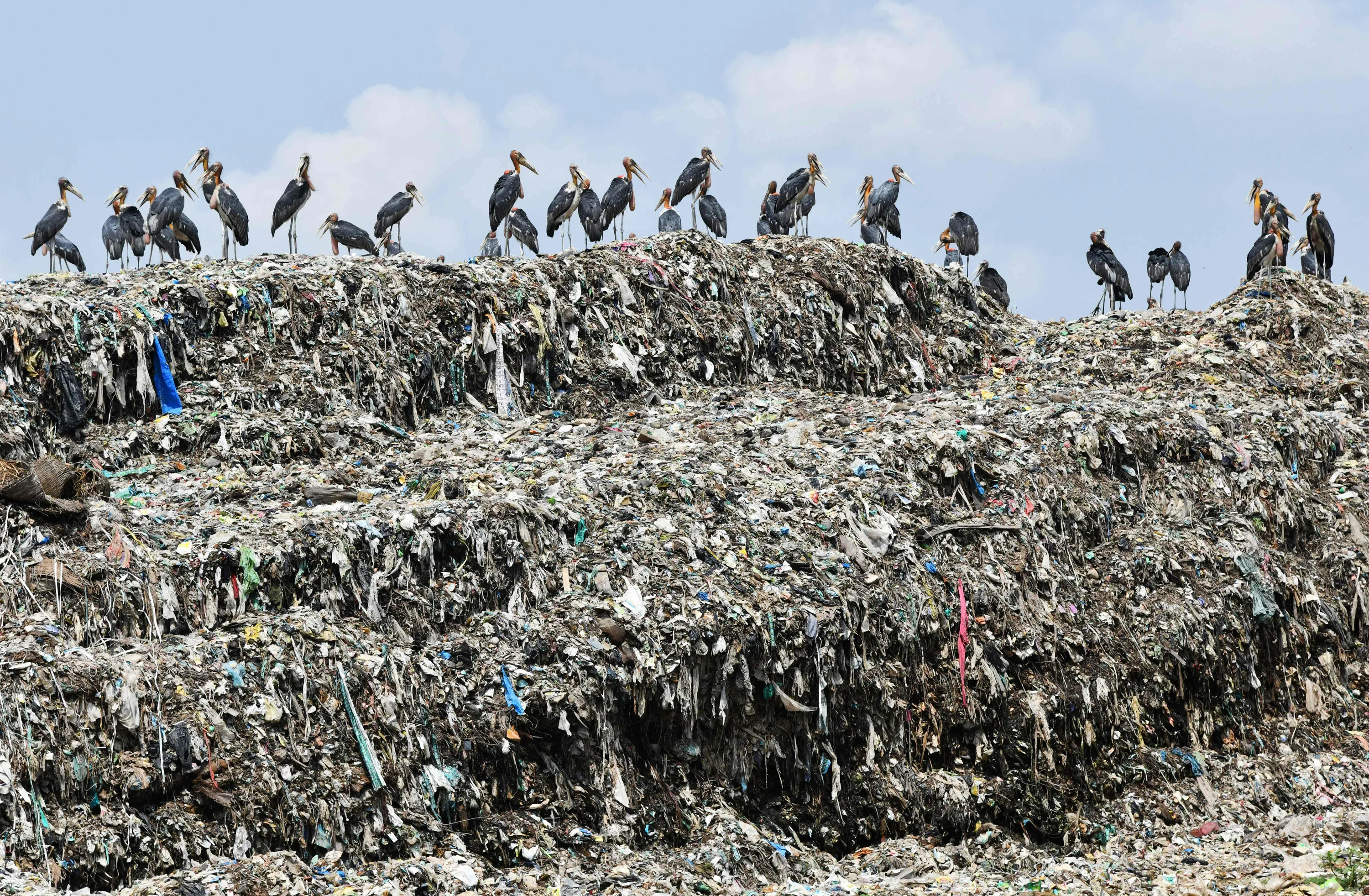 Great adjutant storks stand atop garbage in a landfill at Boragoan area in Guwahati on May 8, 2018. (Photo by Biju Boro/AFP Photo)