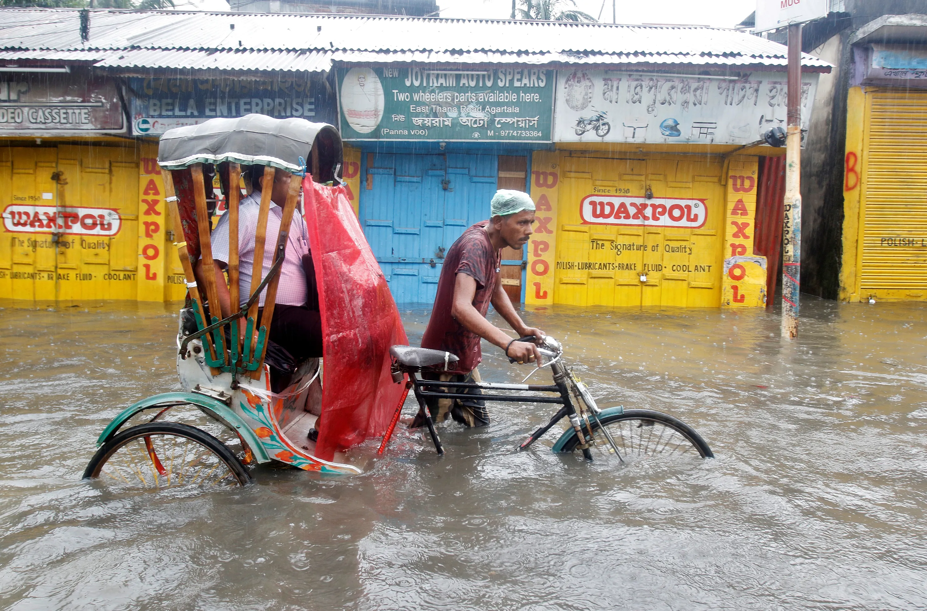 A man paddles his rickshaw as he helps a passenger wade through a water-logged street during heavy rains in Agartala May 18, 2018. (Photo by Jayanta Dey/Reuters)
