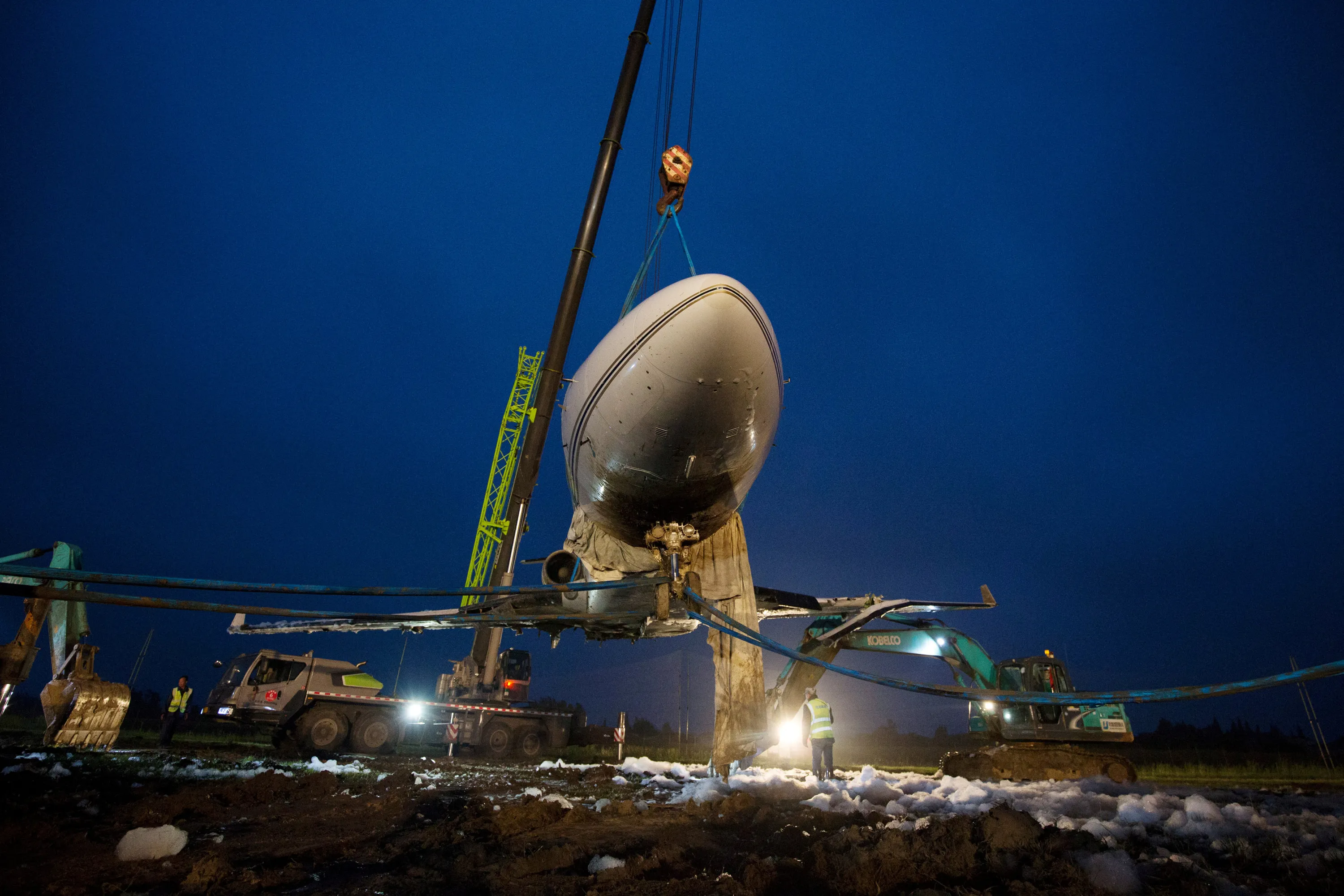 A Star Jet business plane that veered off the runway at the Taizhou International Airport is seen lifted in Yangzhou, Jiangsu province, China May 21, 2018. (Photo by Reuters/China Stringer Network)