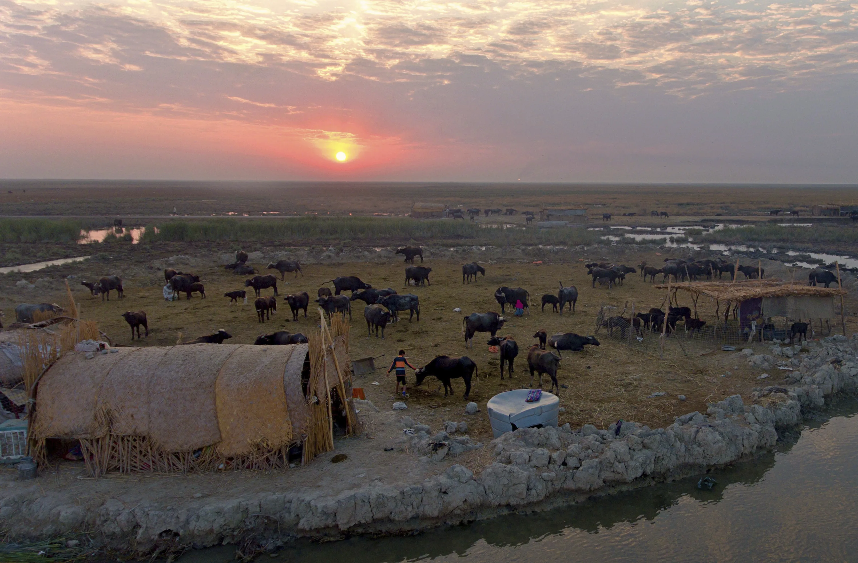 In this Monday, September 11, 2017 photo, the Sun sets over an island paddock for water buffalo in the Chabaish marsh in Nasiriyah, about 200 miles (320 kilometers) southeast of Baghdad, Iraq. Iraq’s southern marshes, a lush remnant of the cradle of civilization, were reborn after the 2003 fall of Saddam Hussein when residents dismantled dams he had built a decade earlier to drain the area in order to root out Shiite rebels. But now the largest wetlands in the Middle East are imperiled again, by government mismanagement and new upstream projects. (Photo by Nabil al-Jurani/AP Photo)