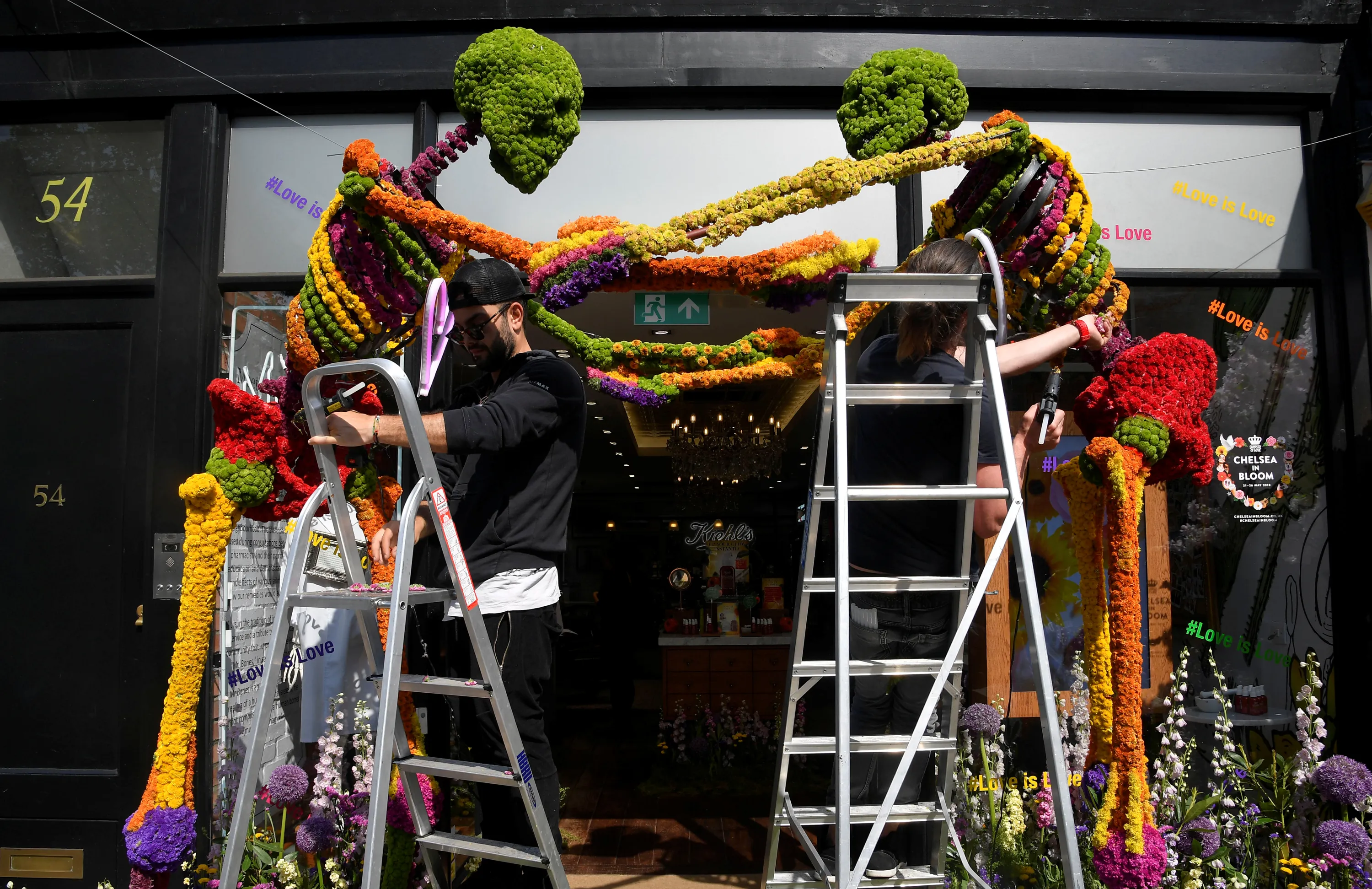 Florists work on a floral display and design outside of a shop front which is participating in the Chelsea In Bloom festival in London, Britain on May 22, 2018. (Photo by Toby Melville/Reuters)