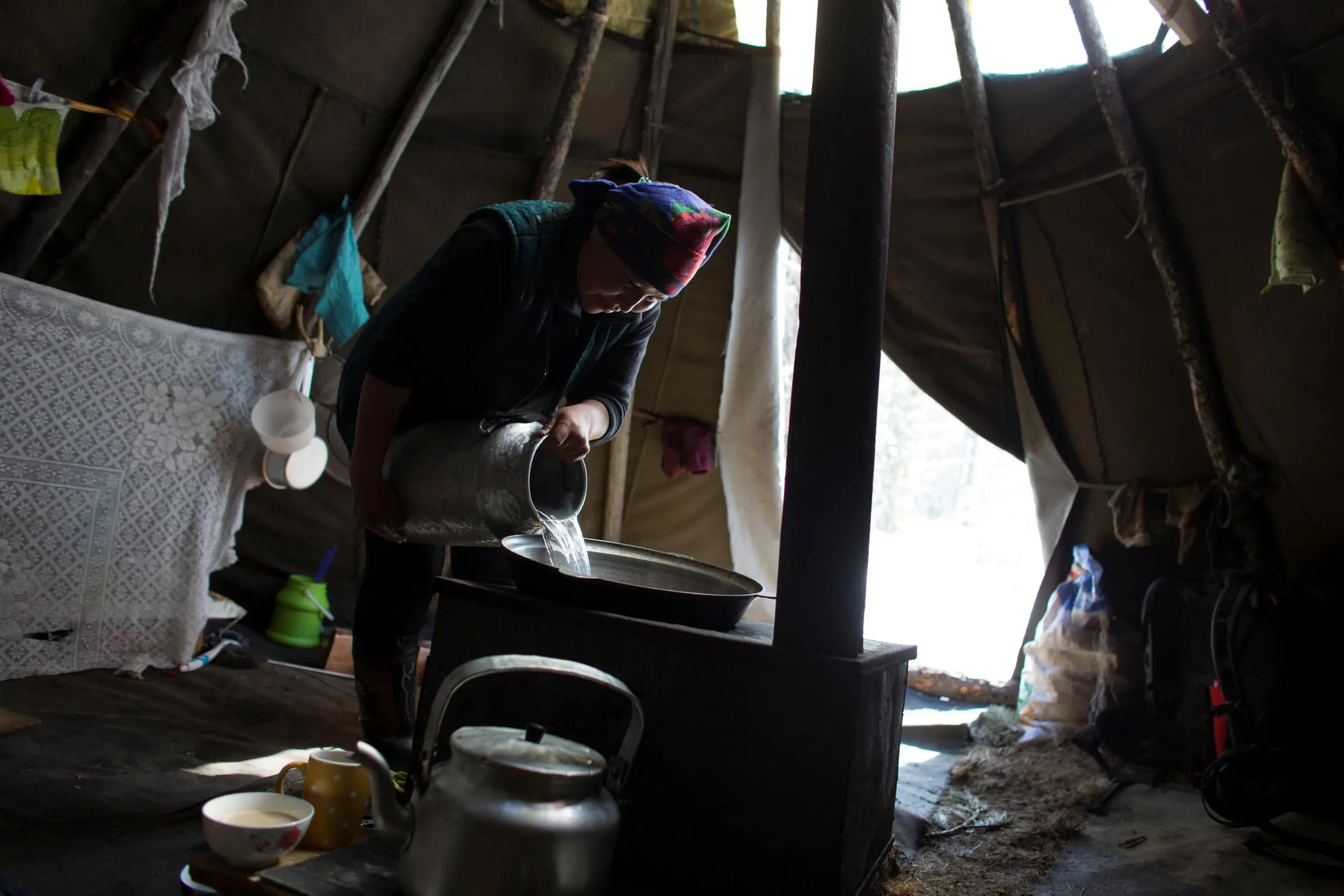 Baigalmaa Munkhbat prepares food for her nomad family in their tent near the village of Tsagaannuur, Khovsgol aimag, Mongolia, April 19, 2018. (Photo by Thomas Peter/Reuters)