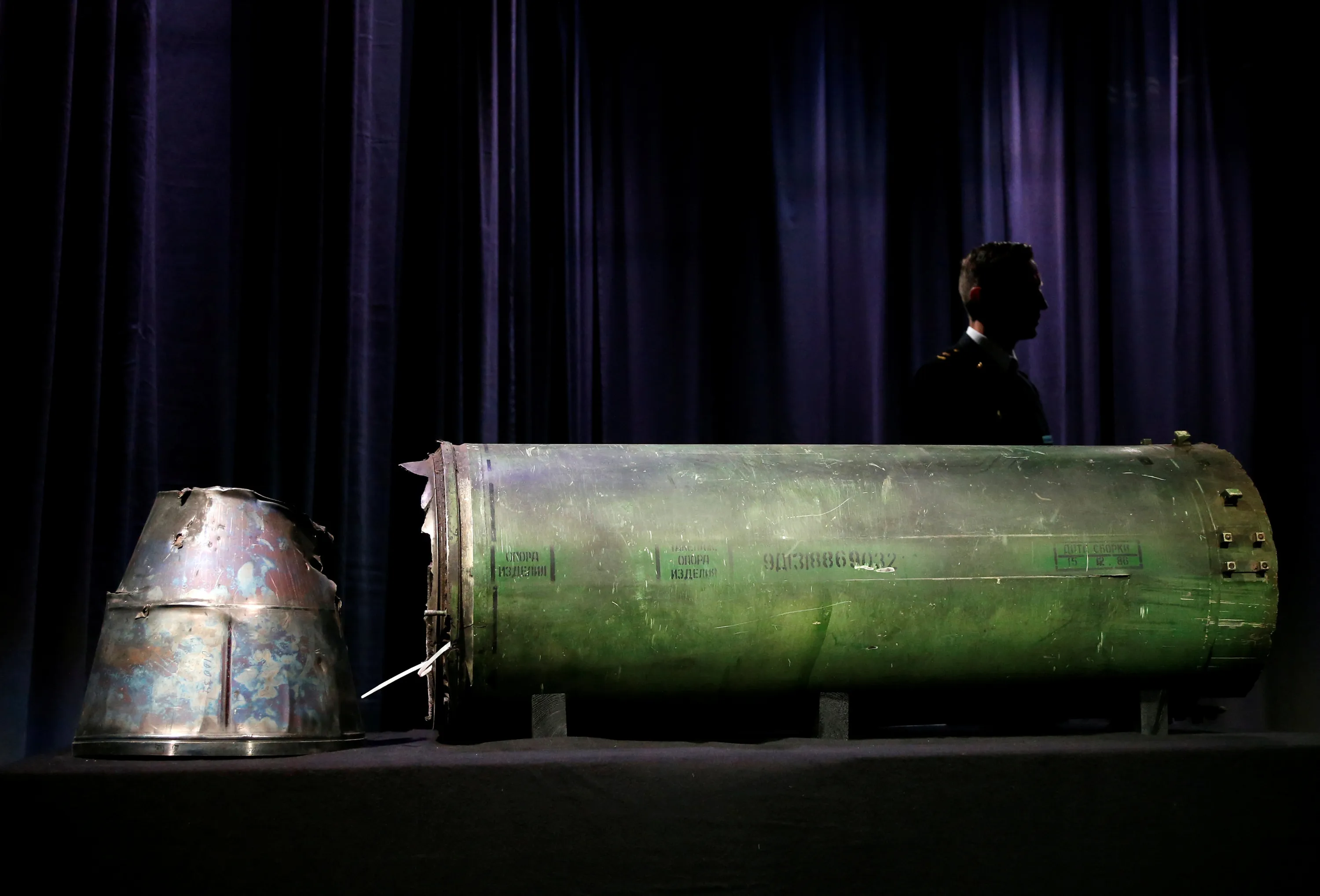 A damaged missile is displayed during a news conference by members of the Joint Investigation Team, comprising the authorities from Australia, Belgium, Malaysia, the Netherlands and Ukraine who present interim results in the ongoing investigation of the 2014 MH17 crash that killed 298 people over eastern Ukraine, in Bunnik, Netherlands, May 24, 2018. Investigators also displayed parts of the engine casing and exhaust system of a Buk 9M38 series missile recovered from eastern Ukraine and showed photos of a unique serial number on the missile. Team members said that careful analysis of video and photos from social media traced the journey of the Russian missile convoy into Ukraine and identified the launcher system. (Photo by Francois Lenoir/Reuters)