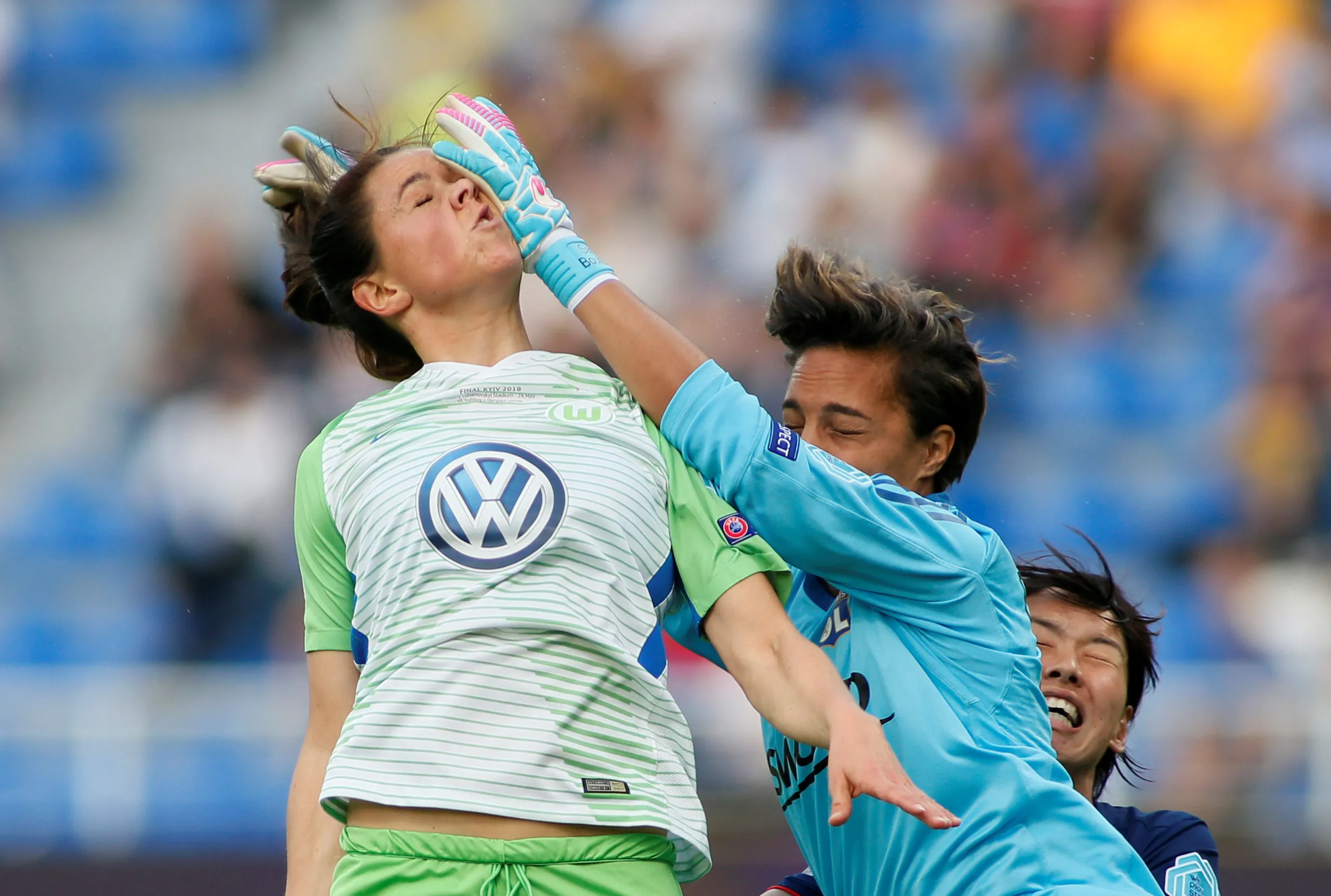Wolfsburg's Sara Bjork Gunnarsdottir in action with Olympique Lyonnais' Sarah Bouhaddi during the UEFA Women' s Champions League final football match Vfl Wolfsburg vs Olympique Lyonnais at the Valeriy Lobanovsky stadium in Kiev on May 24, 2018. (Photo by Valentyn Ogirenko/Reuters)