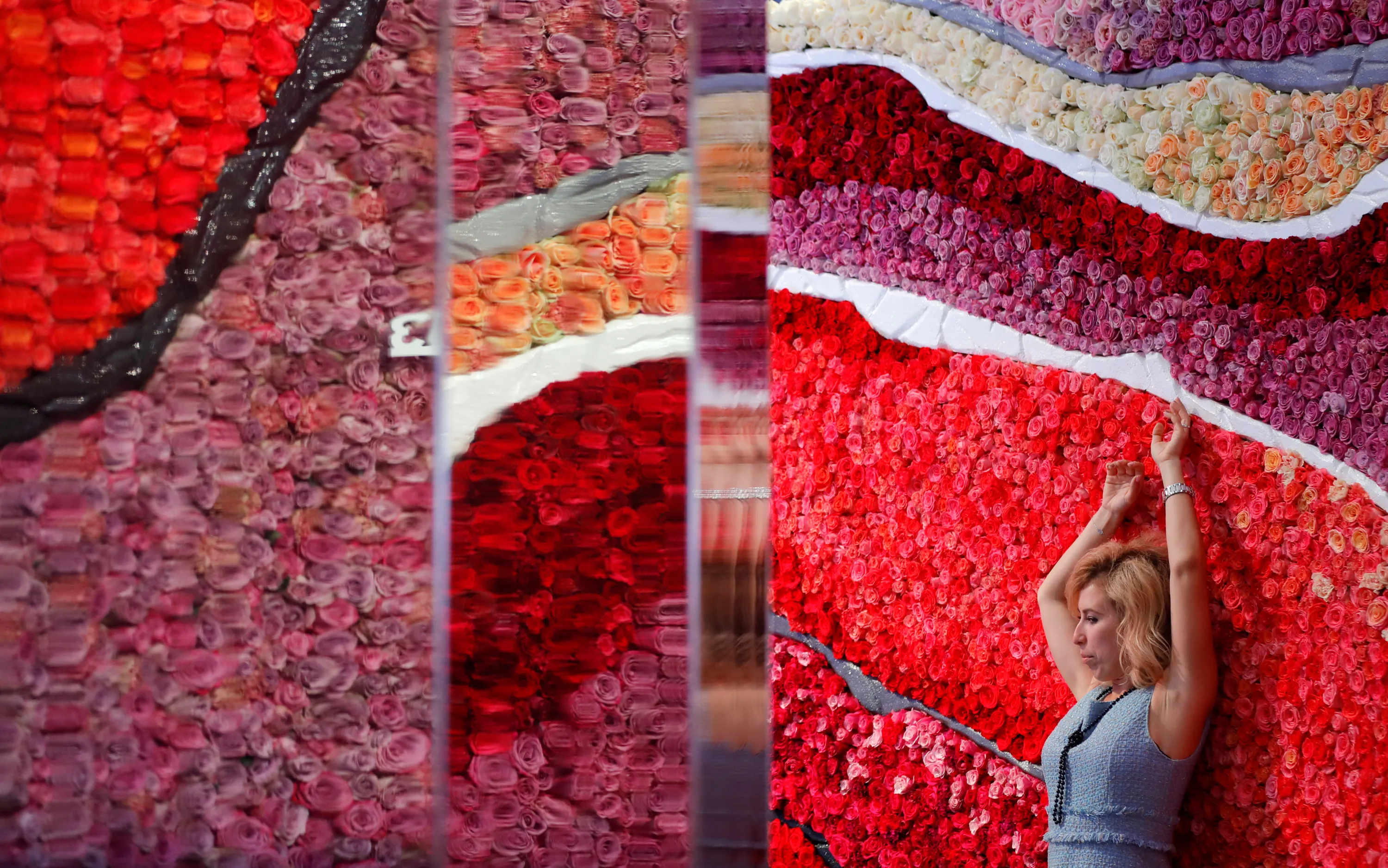 A woman poses as her acquaintance (not seen) takes pictures of her at a stand during the St. Petersburg International Economic Forum (SPIEF), Russia May 24, 2018. (Photo by Sergei Karpukhin/Reuters)