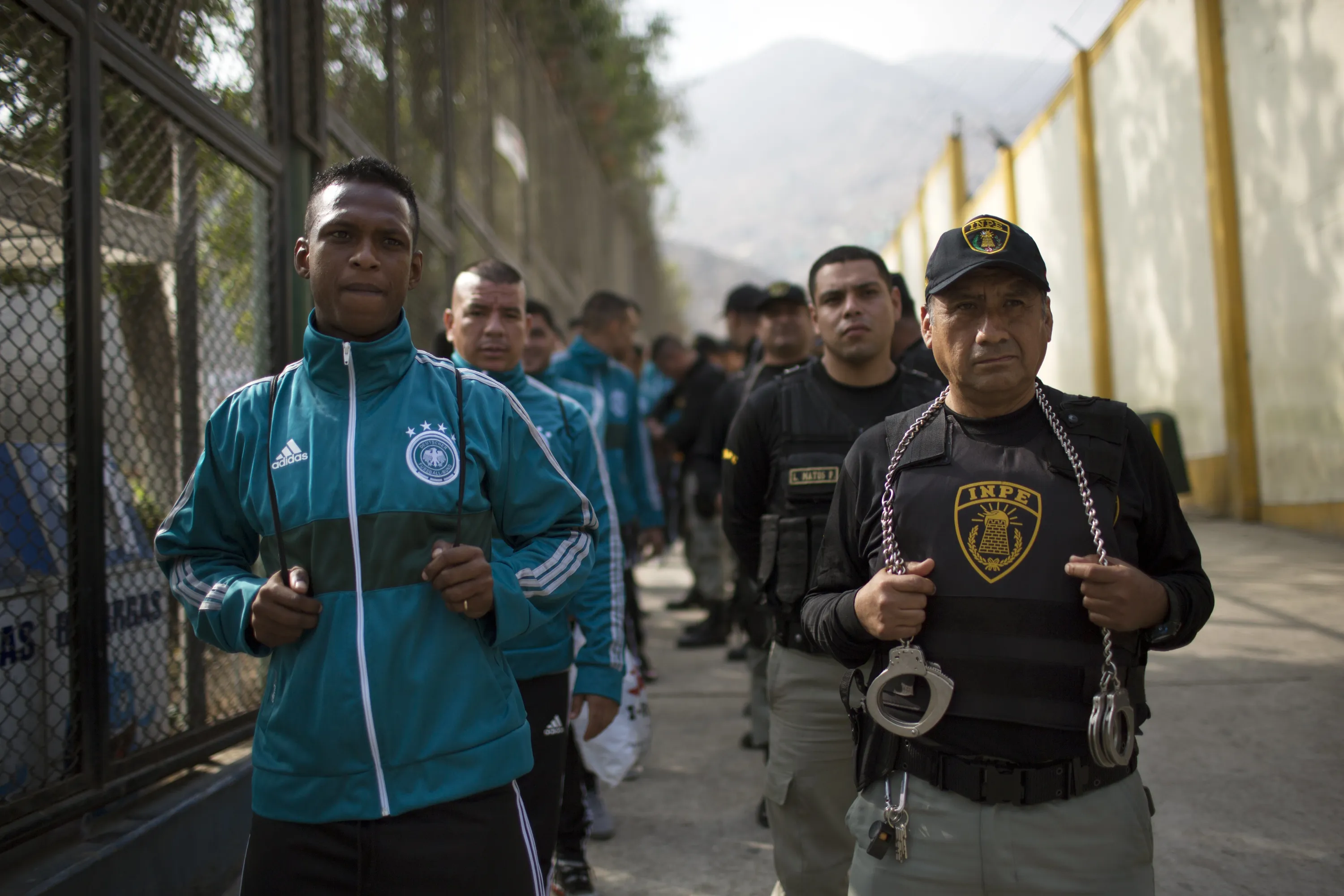 Escorted by prison guards, inmates of a football team wait in a line before the start of a soccer match in the San Juan de Lurigancho prison, in Lima, Peru, Thursday, May 24, 2018. (Photoby Rodrigo Abd/AP Photo)
