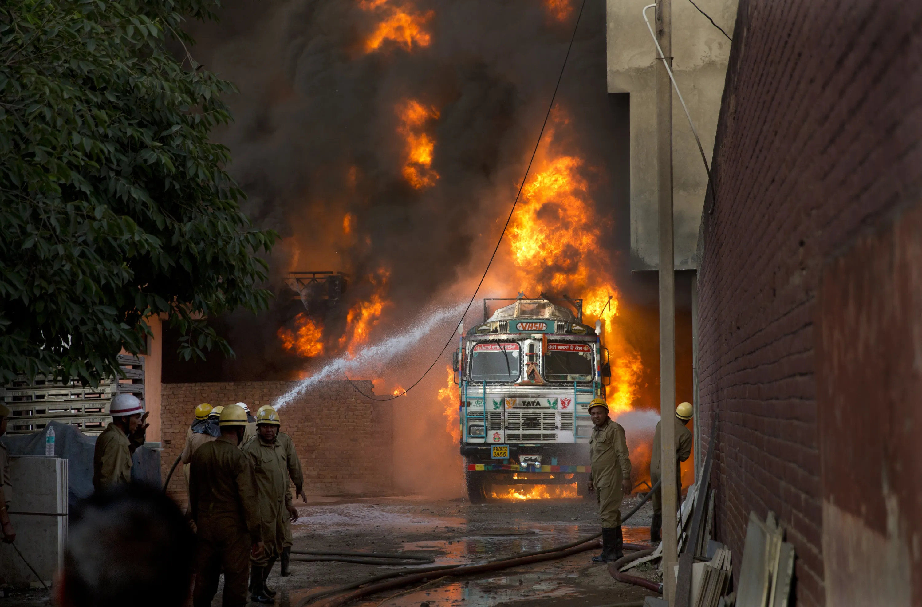 Firefighters work to douse flames on a truck in New Delhi, India, Tuesday, May 29, 2018. The fire that started in a truck spread to a nearby warehouse. No casualties have been reported. (Photo by Manish Swarup/AP Photo)