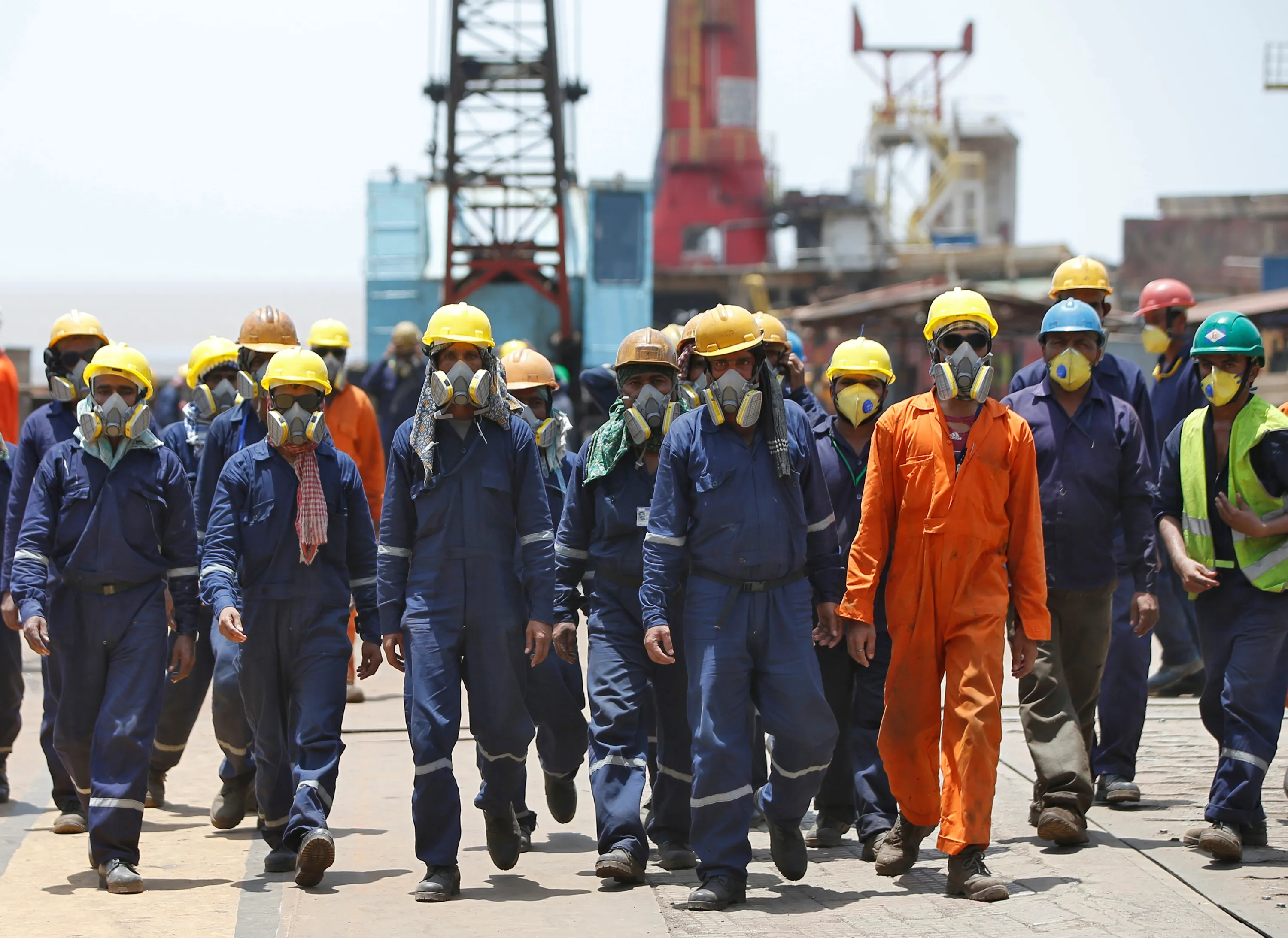 Workers wearing protective gear arrive to dismantle a decommissioned ship at the Alang shipyard in Gujarat, India, May 29, 2018. (Photo by Amit Dave/Reuters)