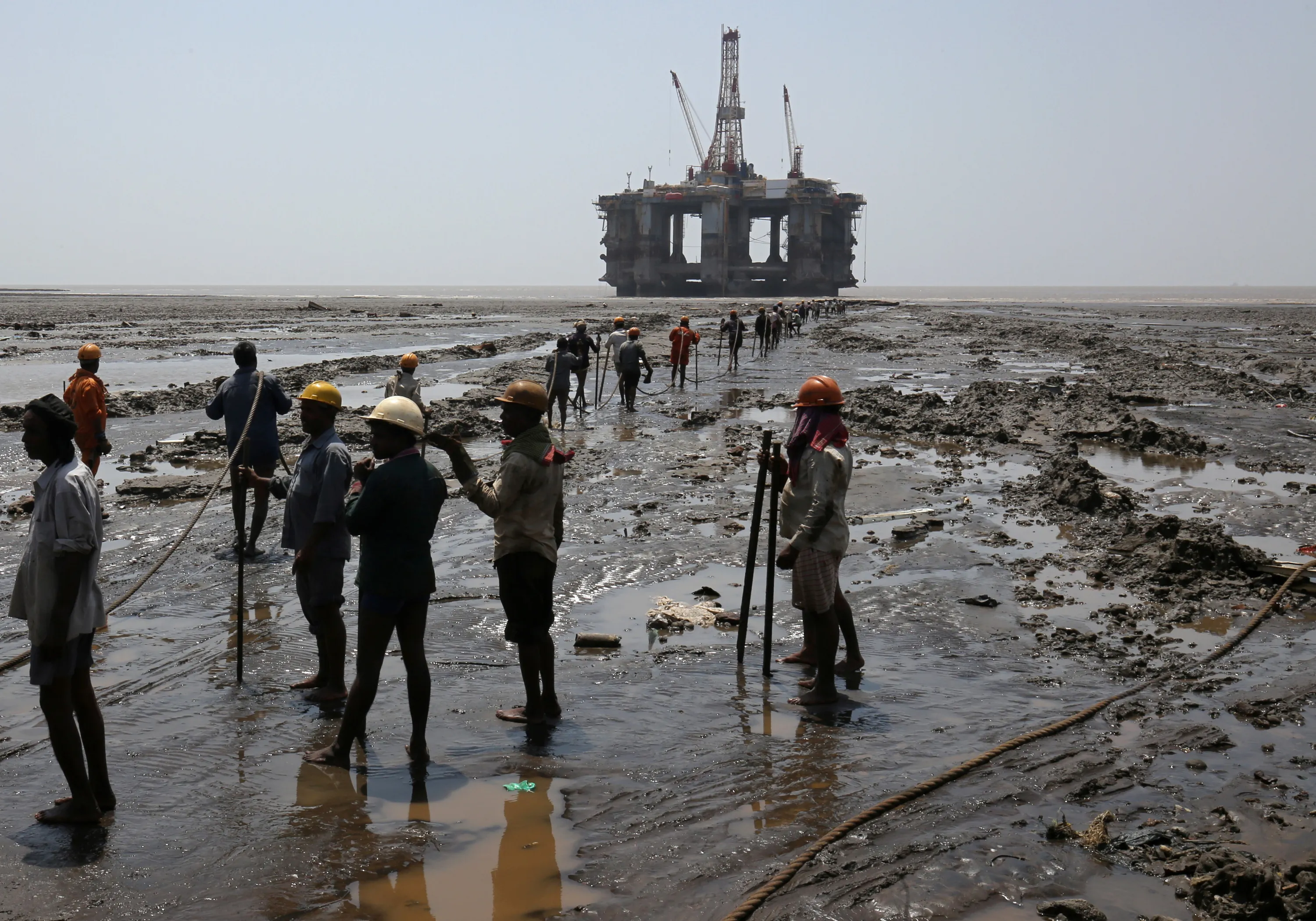 Workers prepare to tie a rope to a decommissioned oil rig to dismantle it at the Alang shipyard in Gujarat, India, May 29, 2018. (Photo by Amit Dave/Reuters)
