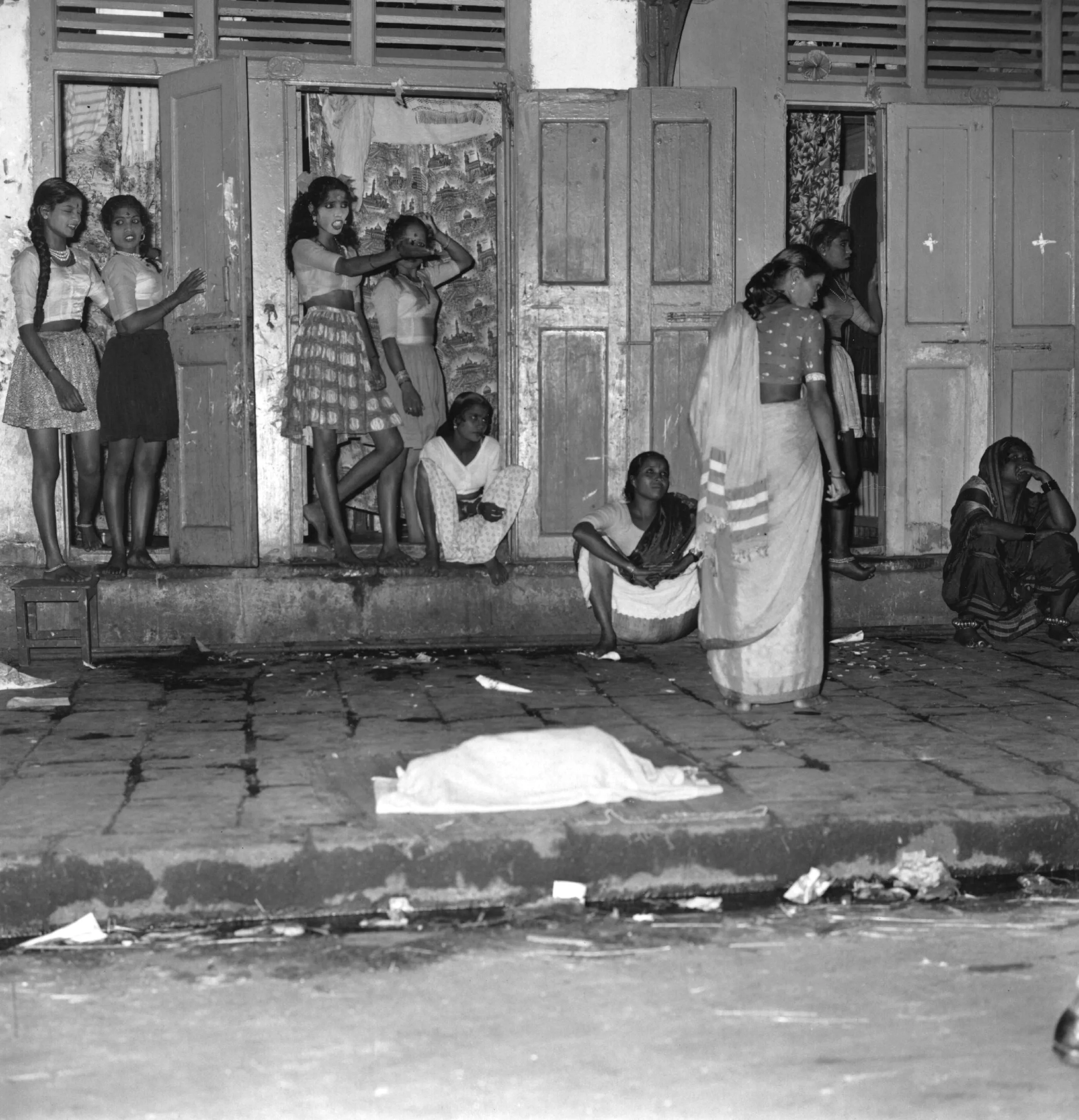A group of Bombay prostitutes standing outside the 'cages' from which they work. (Photo by Express Newspapers/Getty Images)