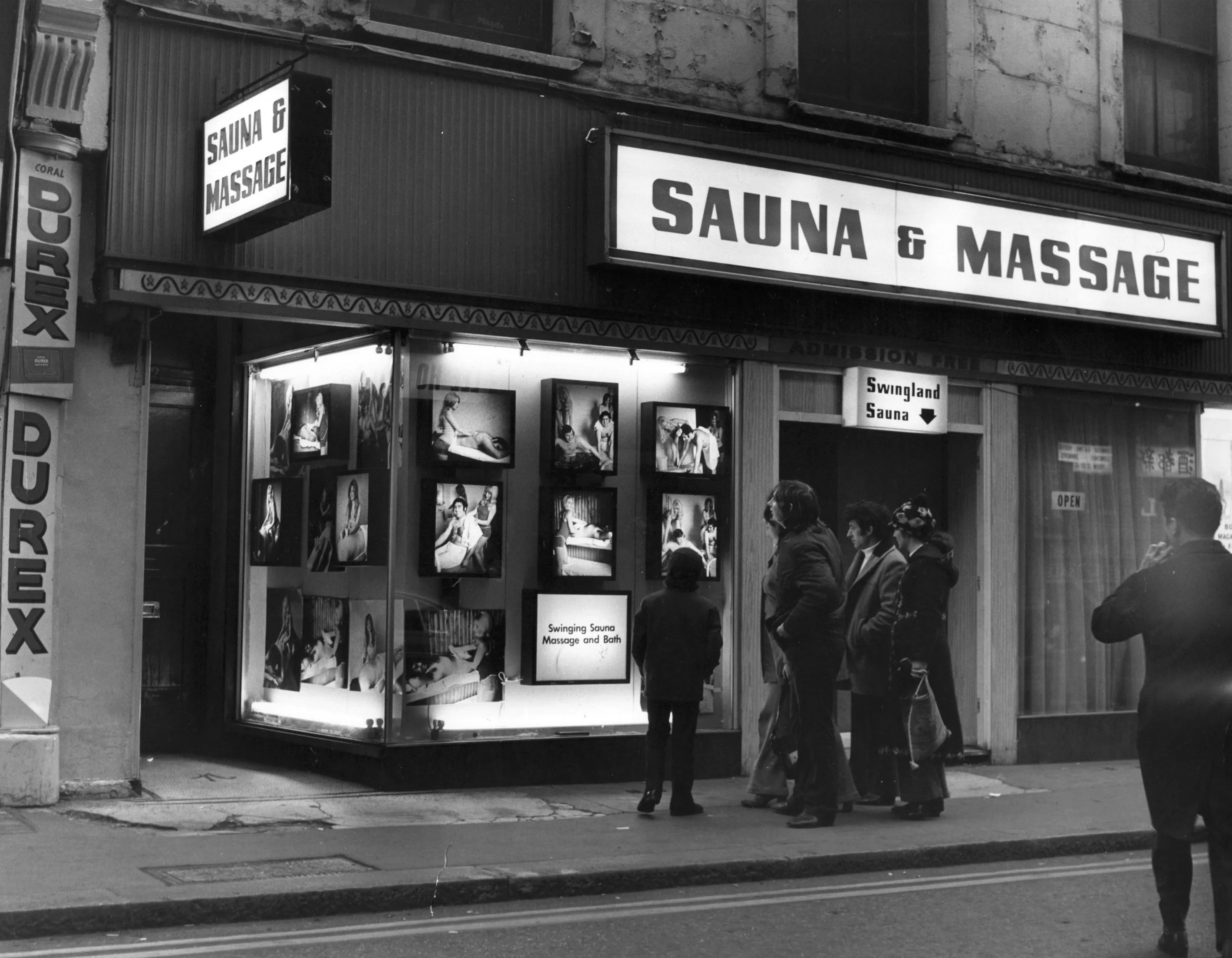 A group of men admire the photographs in the window of Swingland Sauna and Massage Parlour in Soho, London. (Photo by Fox Photos/Getty Images)