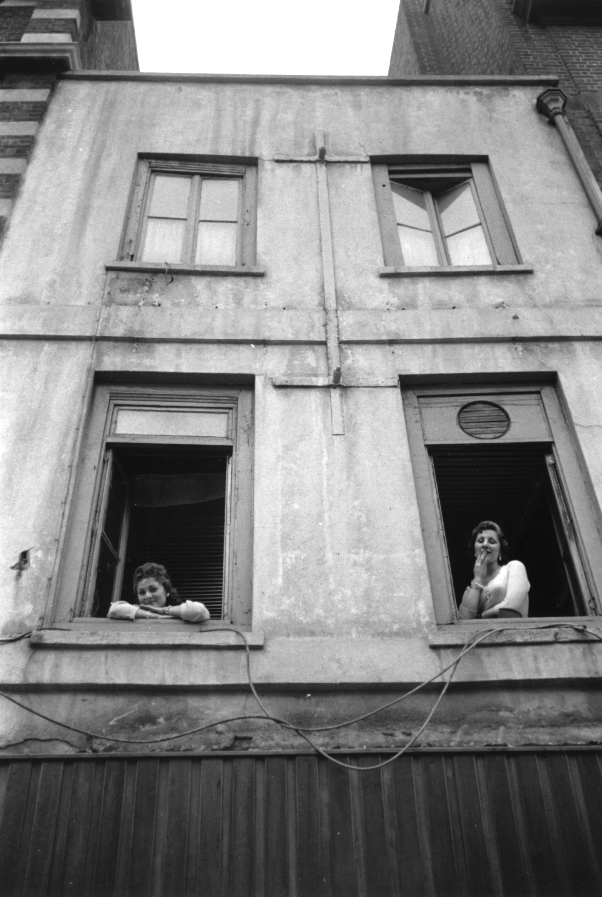 Two prostitutes lean out of the windows of a brothel in Soho, London. Original Publication: Picture Post - 8593 - I Am The Queen Of Soho - pub. 1956 (Photo by Thurston Hopkins/Getty Images)
