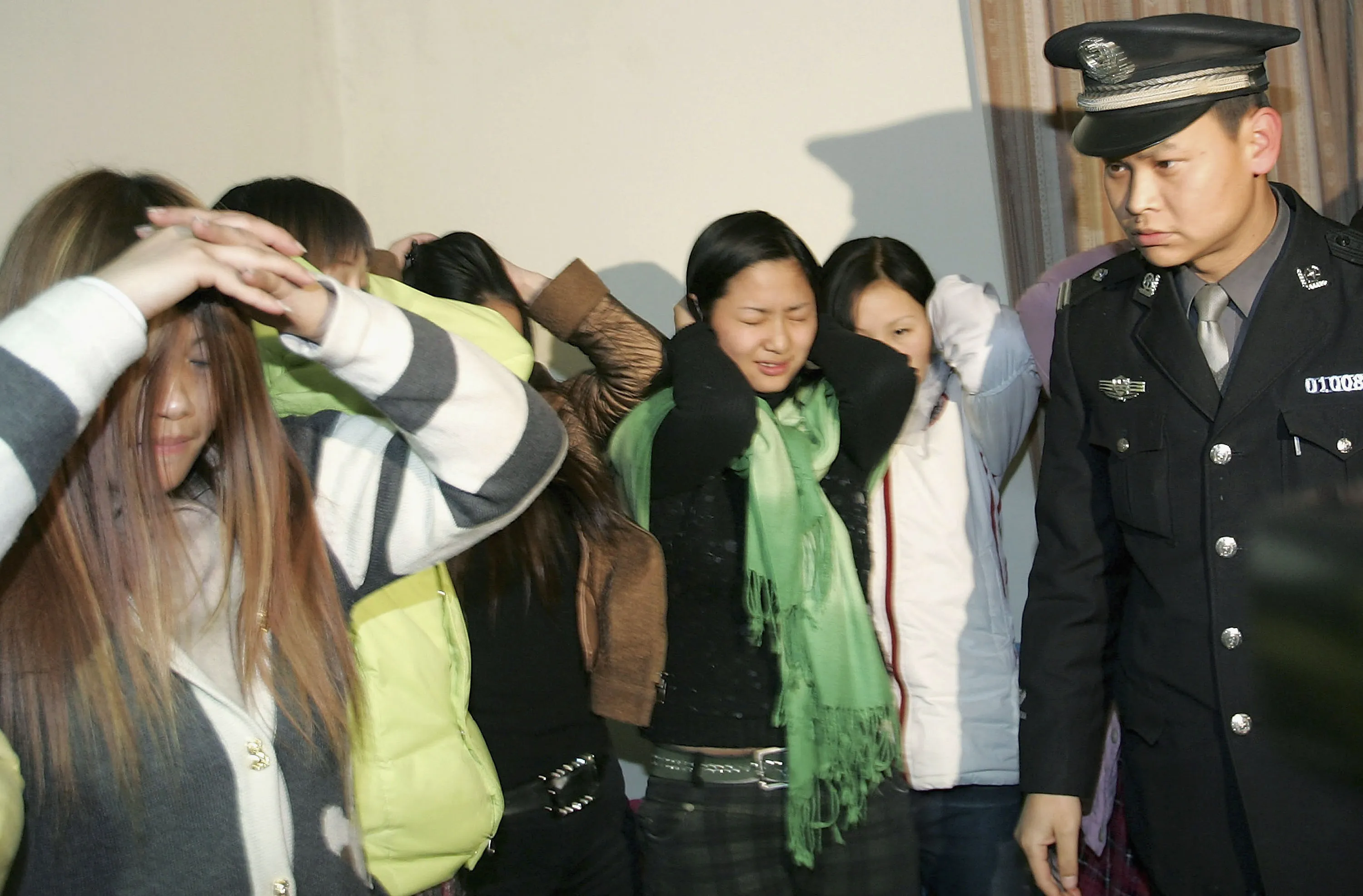 CHENGDU, CHINA - NOVEMBER 23: (CHINA OUT) A policeman guards arrested prostitutes at the Chengdu Municipal Public Security Bureau on November 23, 2005 in Chengdu of Sichuan Province, China. At least 17 prostitutes and whoremasters were arrested during a police operation in Chengdu. Authorities have launched campaigns to crack down on prostitutions in the city. According to state media, male and female prostitution, both of which are illegal in China, are nonetheless widespread. According to a draft guideline released by the Ministry of Health, prostitutes are being made the focus of the ministry's latest efforts to stem the spread of HIV/AIDS. (Photo by China Photos/Getty Images)
