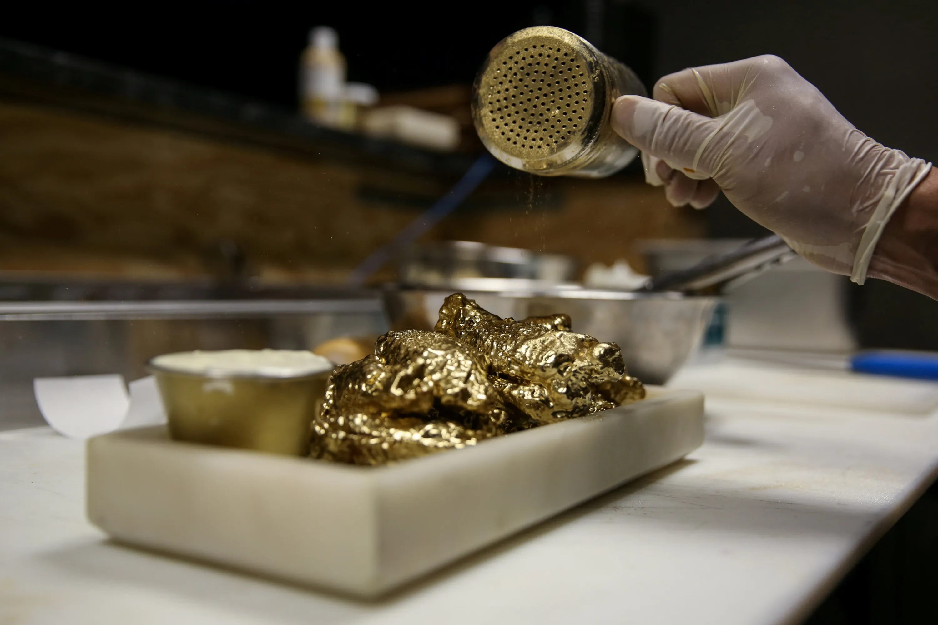 A chef prepares chicken wings dusted in 24-karat gold at the Ainsworth restaurant in Manhattan, New York, U.S. June 8, 2018. (Photo by Amr Alfiky/Reuters)