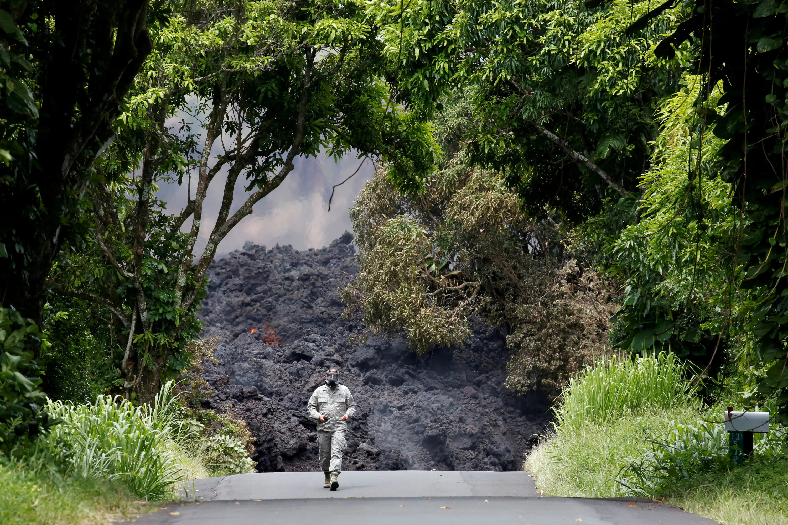 Lieutenant Colonel Charles Anthony, of the Hawaii National Guard, measures sulfur dioxide gas levels at a lava flow on Highway 137 southeast of Pahoa during ongoing eruptions of the Kilauea Volcano in Hawaii, U.S., May 20, 2018. (Photo by Terray Sylvester/Reuters)