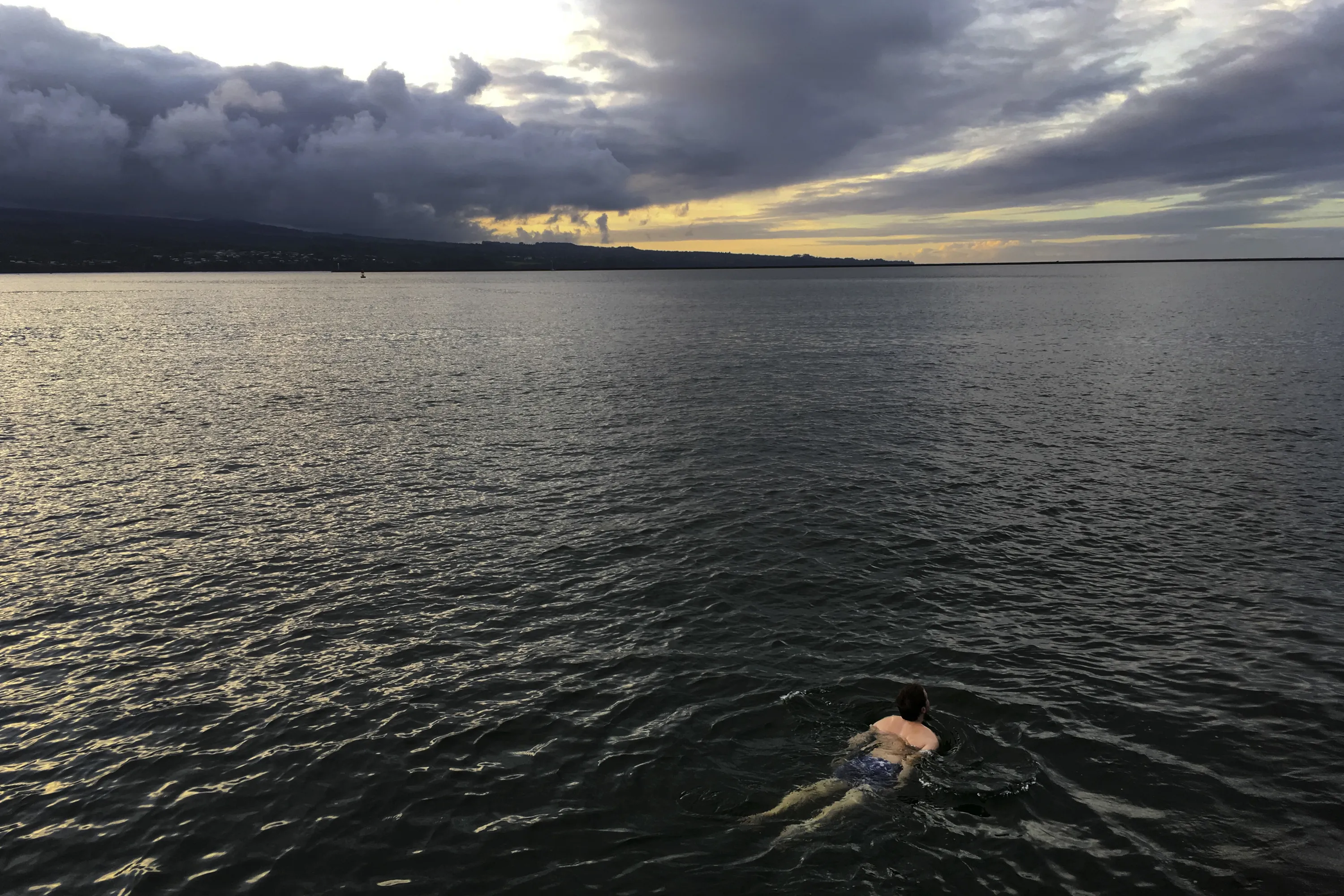 A man swims in the ocean in Hilo, Hawaii, Friday, May 11, 2018. Warnings that Hawaii's Kilauea volcano could shoot boulders and ash out of its summit crater are prompting people to rethink their plans to visit the Big Island. But most of the rest of the island is free of volcanic hazards, and local tourism officials are hoping travelers will recognize the Big Island is ready to welcome them. (Photo by Jae C. Hong/AP Photo)