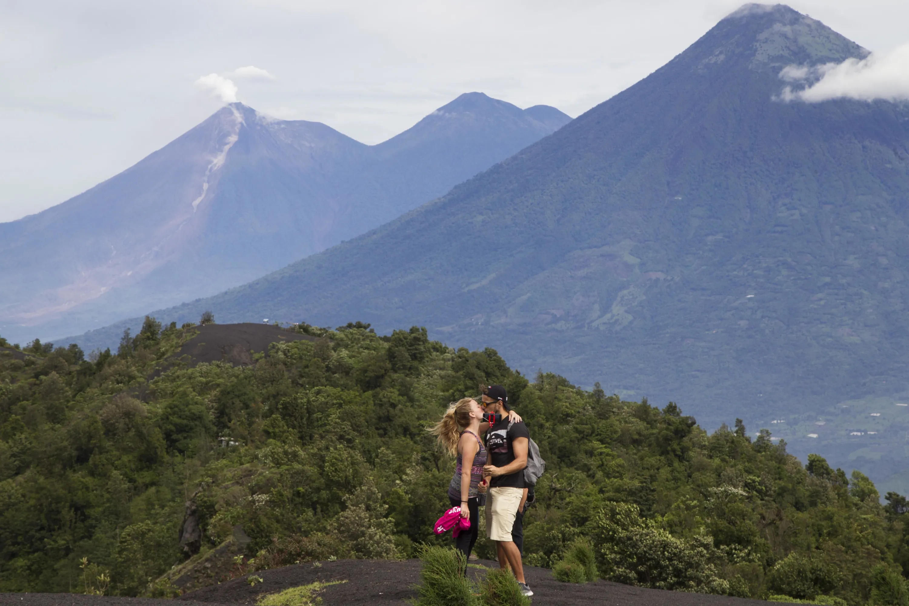 In this June 8, 2018 photo, Aa couple of tourists kiss with the view of the volcanoes, Fuego, left, Acatenango, center, and Agua, right, in the background, from a point in the climb to the Pacaya Volcano, in San Francisco de Sales, Guatemala. Volcano tourism is the life blood of villages like San Francisco de Sales, perched near Pacaya’s peak, and for locals it is a question of learning to live with a generous monster. (Photo by Luis Soto/AP Photo)