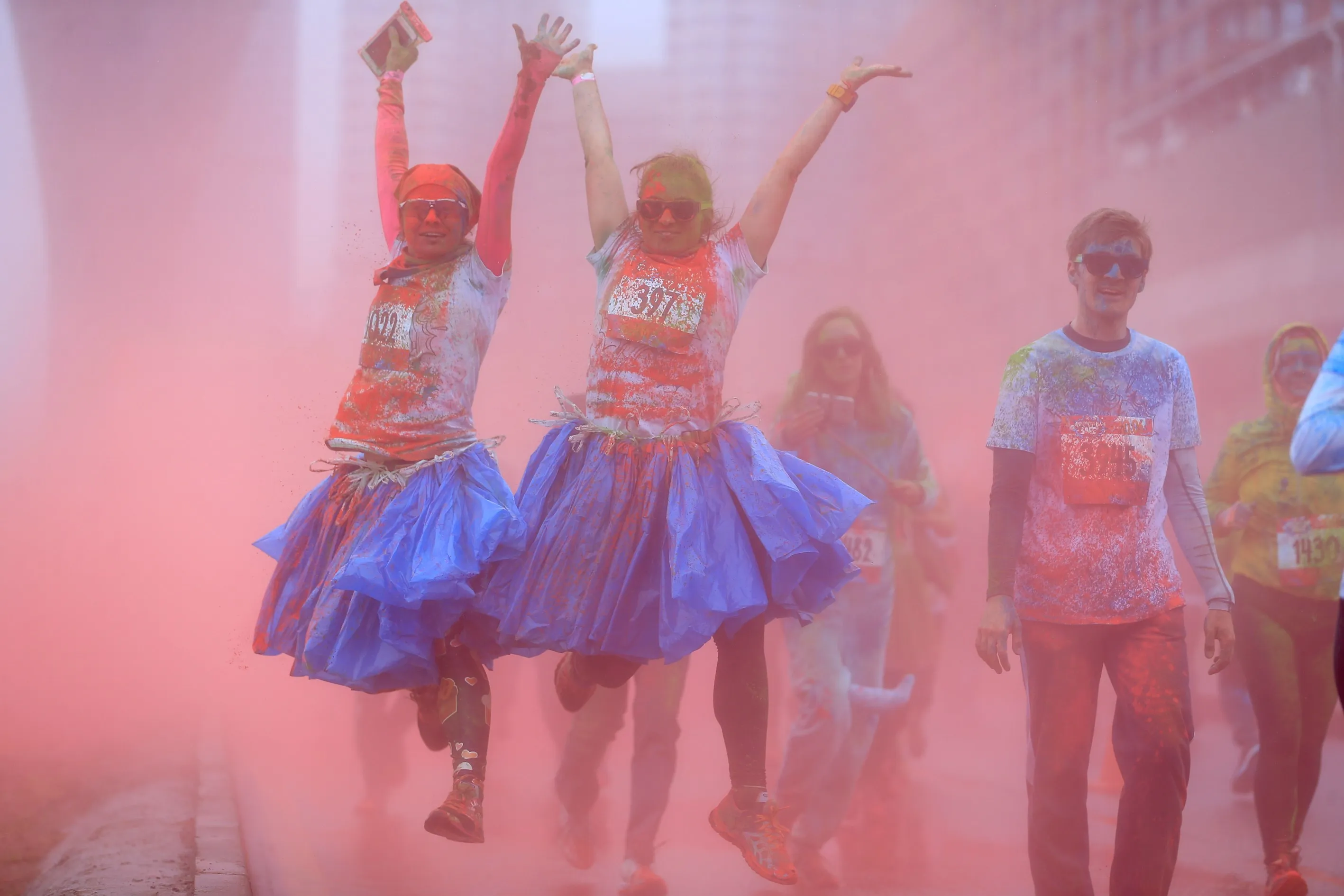Participants take part in the Holi colors run in Moscow, Russia on June 10, 2018. (Photo by Sefa Karacan/Anadolu Agency/Getty Images)