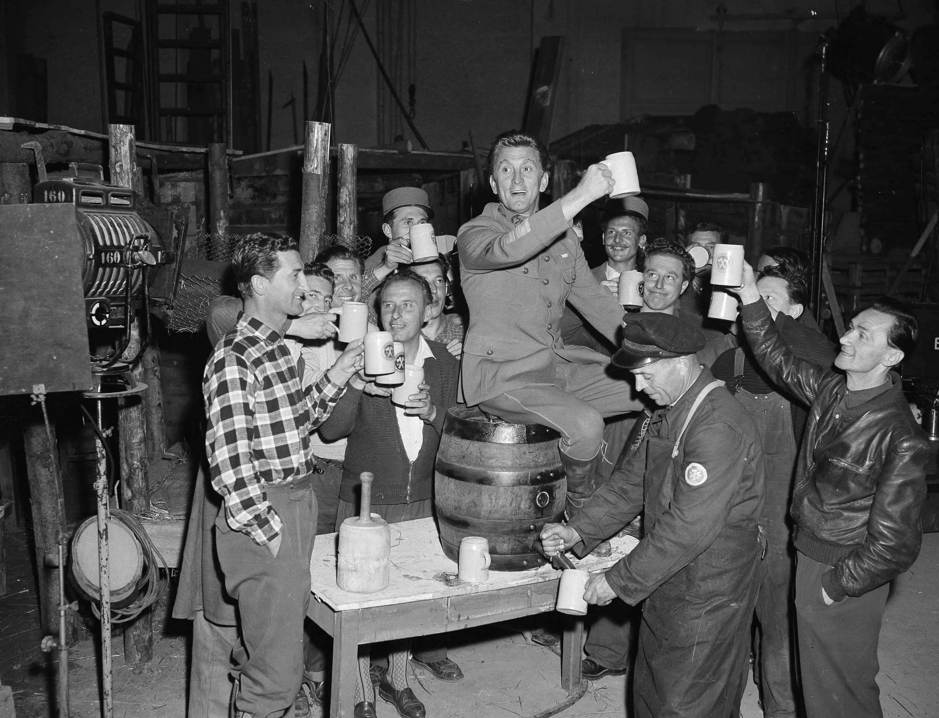 Actor Kirk Douglas invited the studio workers of the Munich Geiselgasteig Studios to a barrel of beer to celebrate the commencement of the shooting of the film “Paths of Glory” March 20, 1957. (Photo by AP Photo/Sandensr)