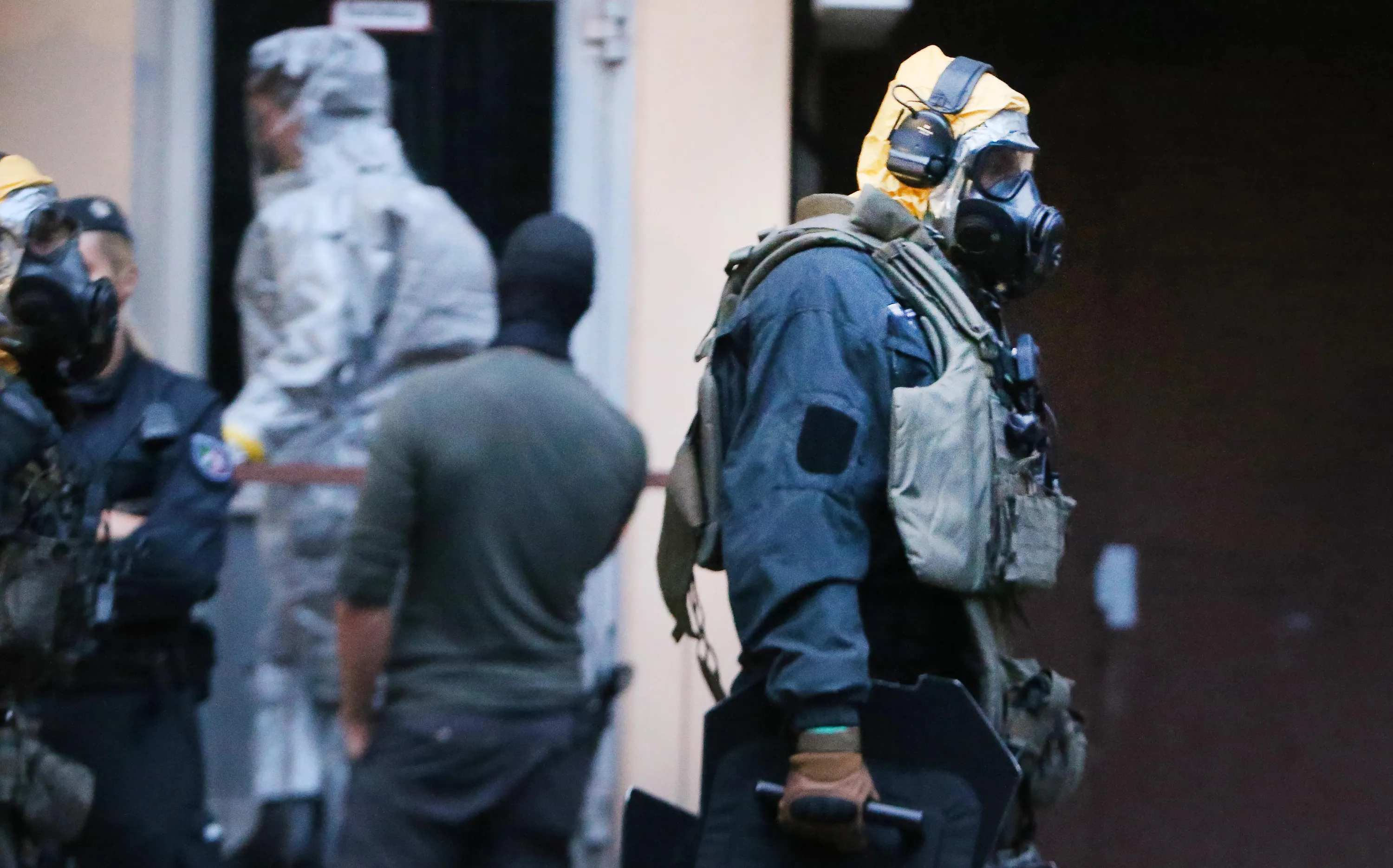 In this Tuesday June 12, 2018 photo, German police officers in protective gear leave an apartment building during an operation in Cologne, Germany. German police are searching the apartment of a 29-year-old Tunisian man who is accused of keeping toxic substances in his home. (Photo by David Young/DPA via AP Photo)