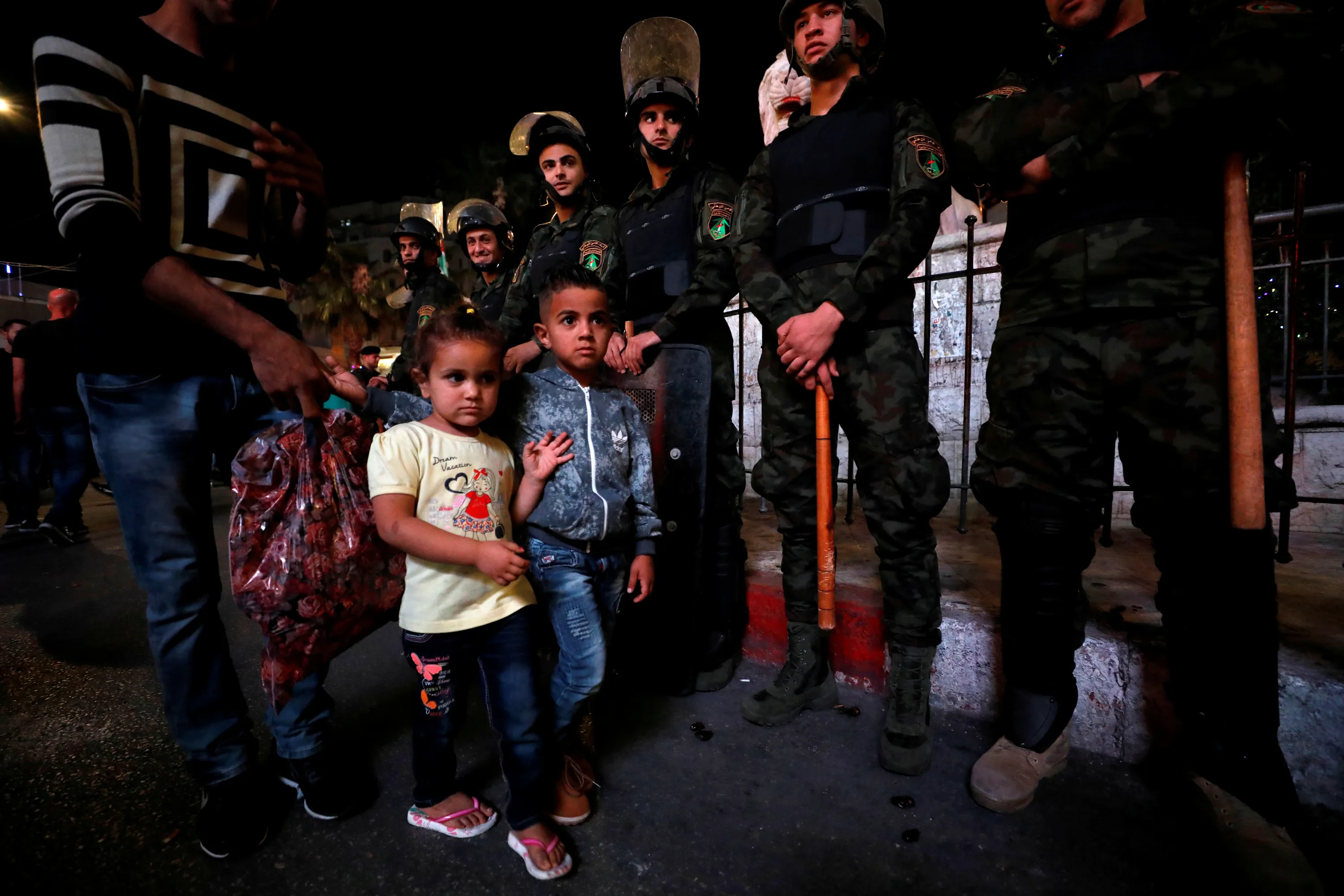 Children walk as members of Palestinian security forces stand guard during a protest calling on President Mahmoud Abbas to end financial sanctions on Palestinians in Gaza, in Ramallah, in the occupied West Bank on June 14, 2018. (Photo by Mohamad Torokman/Reuters)