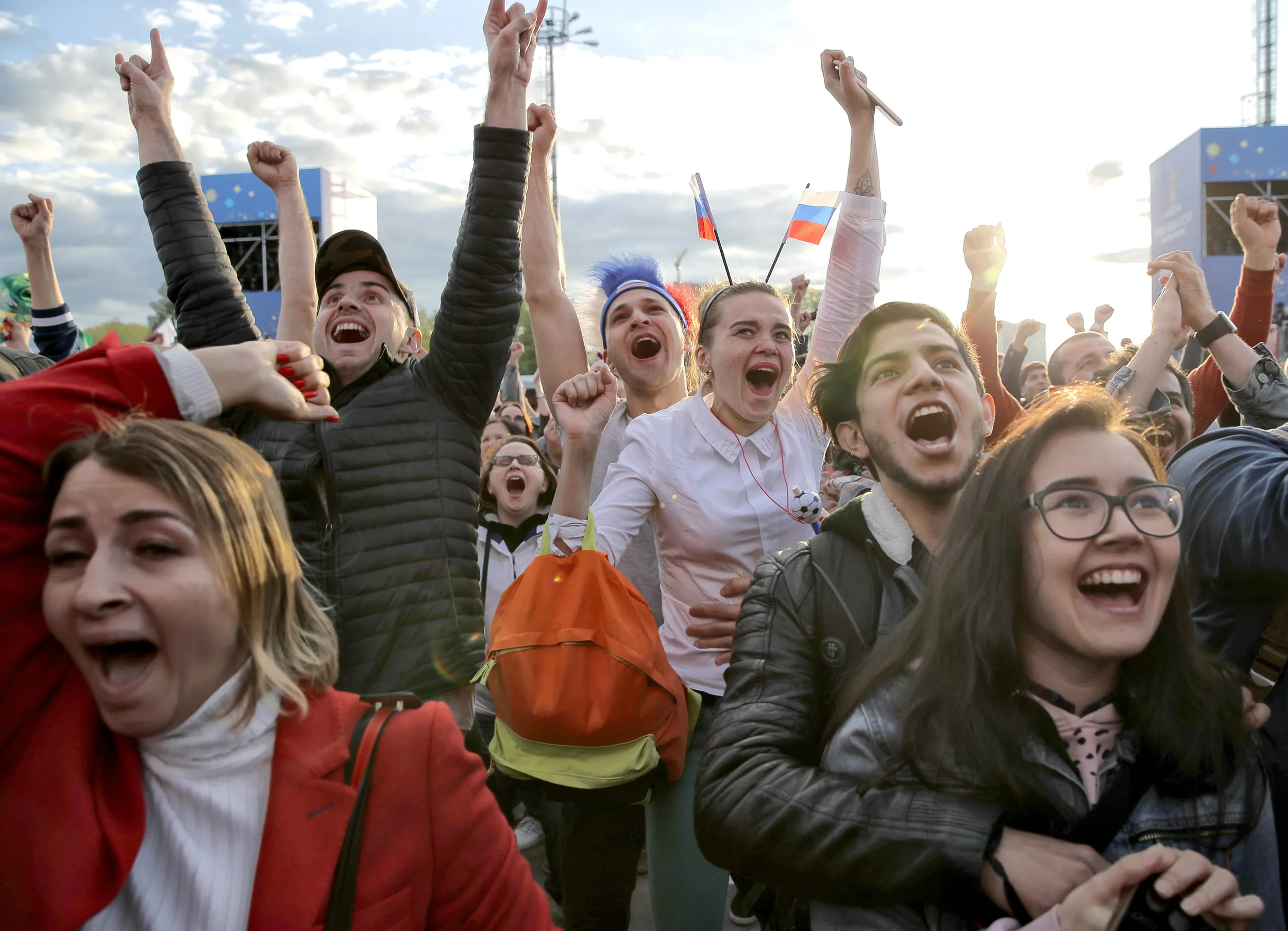 Fans celebrate after Russia scored the first goal during the opening match of the 2018 soccer World Cup, between Russia and Saudi Arabia, in the fan zone in Yekaterinburg, Russia, Thursday, June 14, 2018. (Photo by Vadim Ghirda/AP Photo)