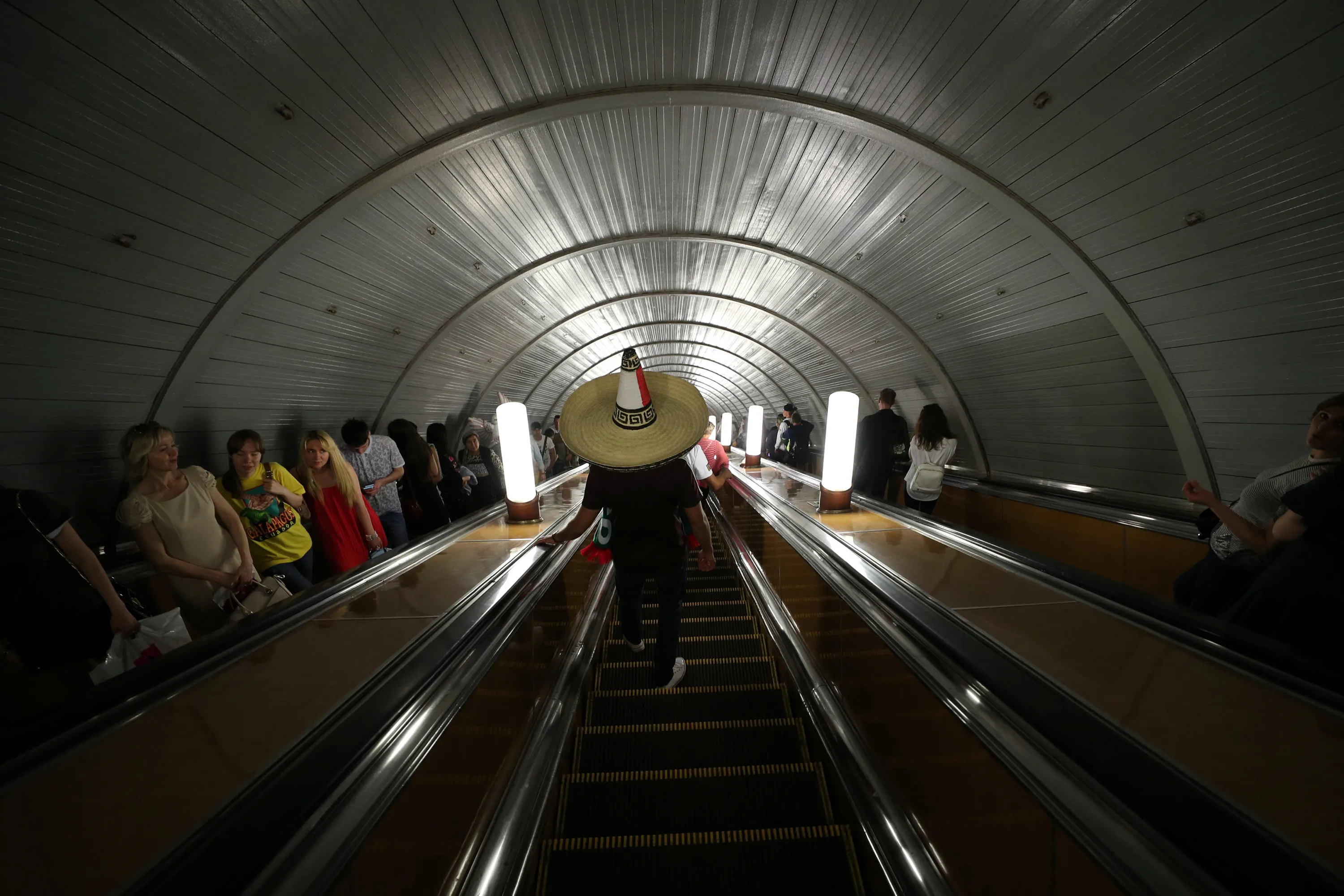 A Mexico's fan travels on the escalator at a metro station before the match between Germany and Mexico at the Luzhniki Stadium in Moscow, Russia on June 17, 2018. (Photo by Albert Gea/Reuters)